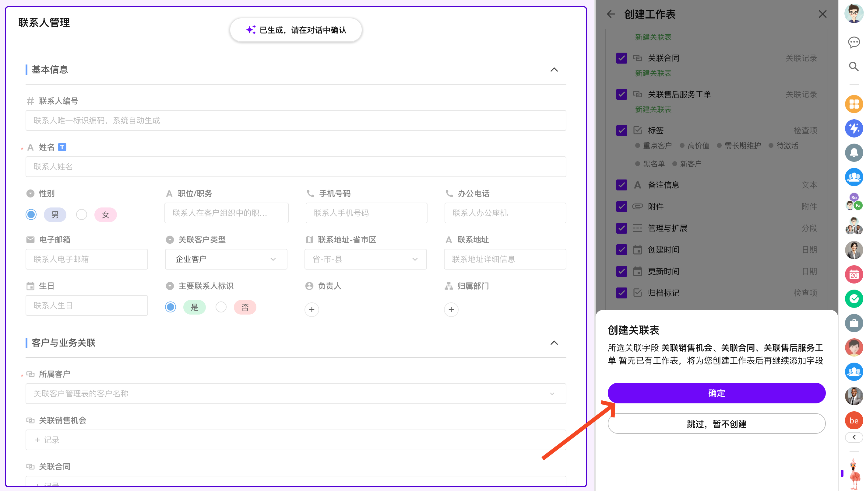 如关联表尚未创建,系统会提示是否继续创建关联工作表;你也可选择跳过并直接保存。