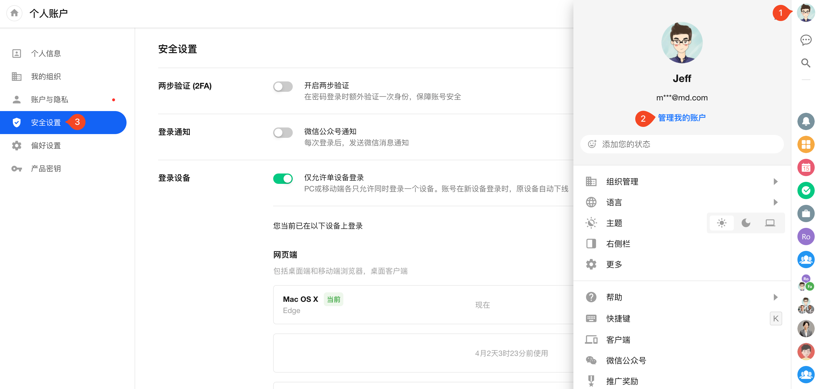关闭允许同时登录: 网页端和移动客户端分别只能有1台设备保持登录,新的设备登录后,同类型其他设备将会自动退出。