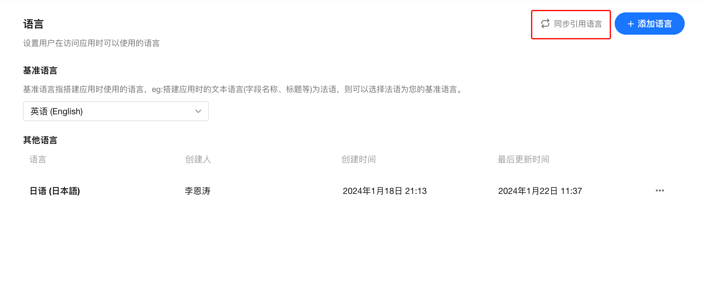 选择一种语言作为基准语言,管理员在搭建应用时按此语言显示应用界面,如功能菜单名称、控件名称等。未选择时,按个人账户语言显示应用界面。