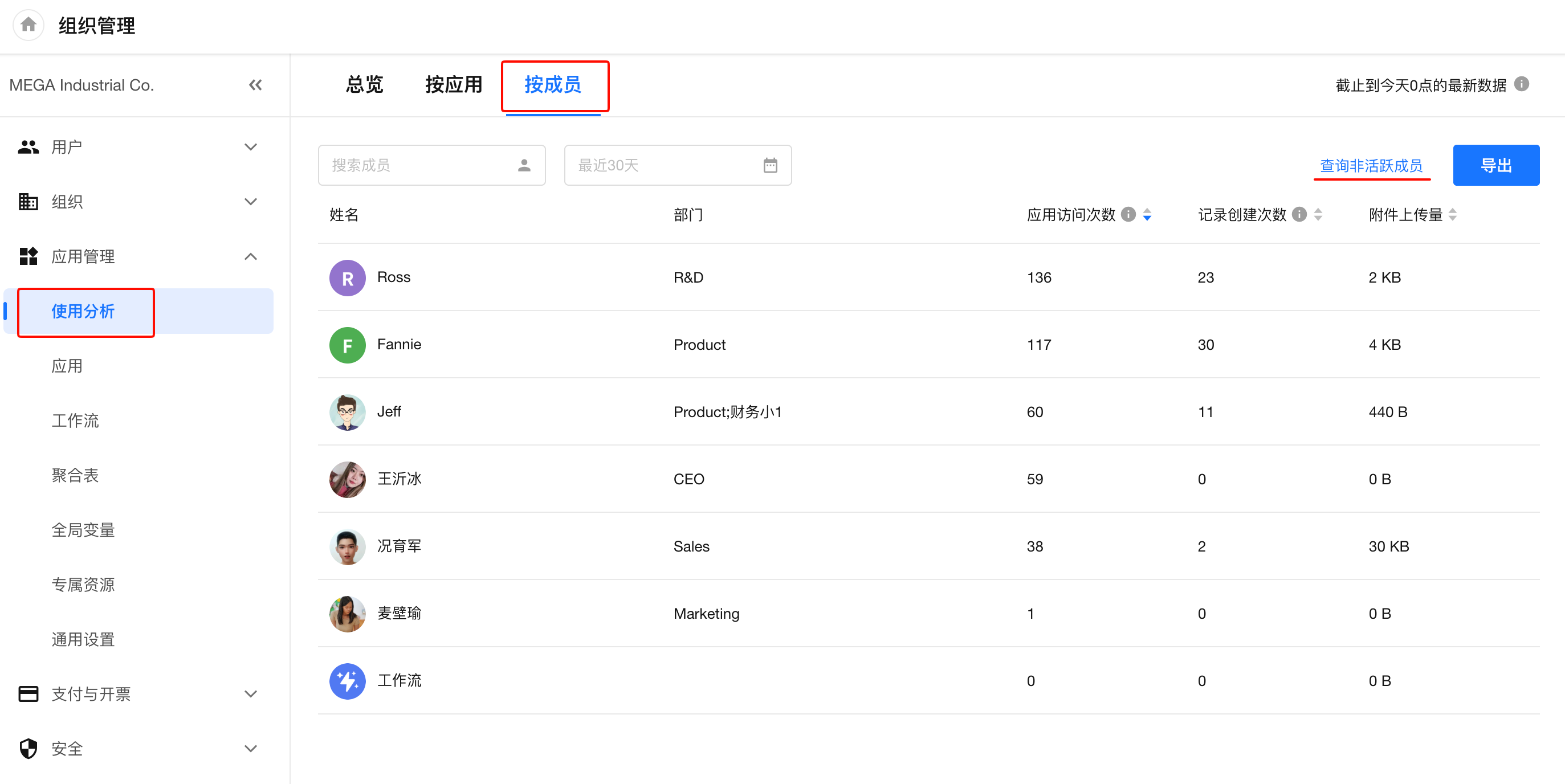 使用分析功能可以帮助管理者随时了解组织内应用的使用情况或成员的使用活跃度等多种指标,主要分两种: