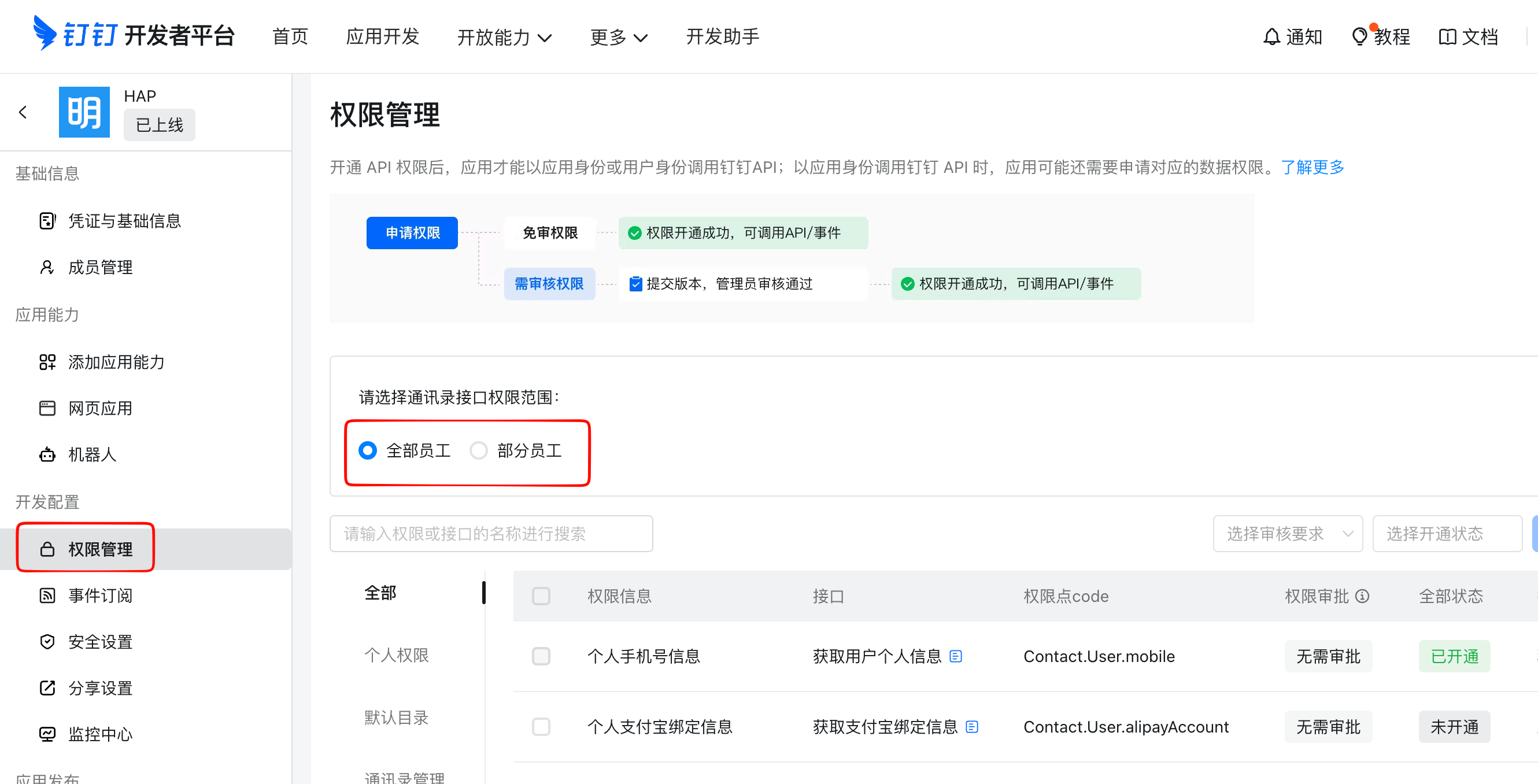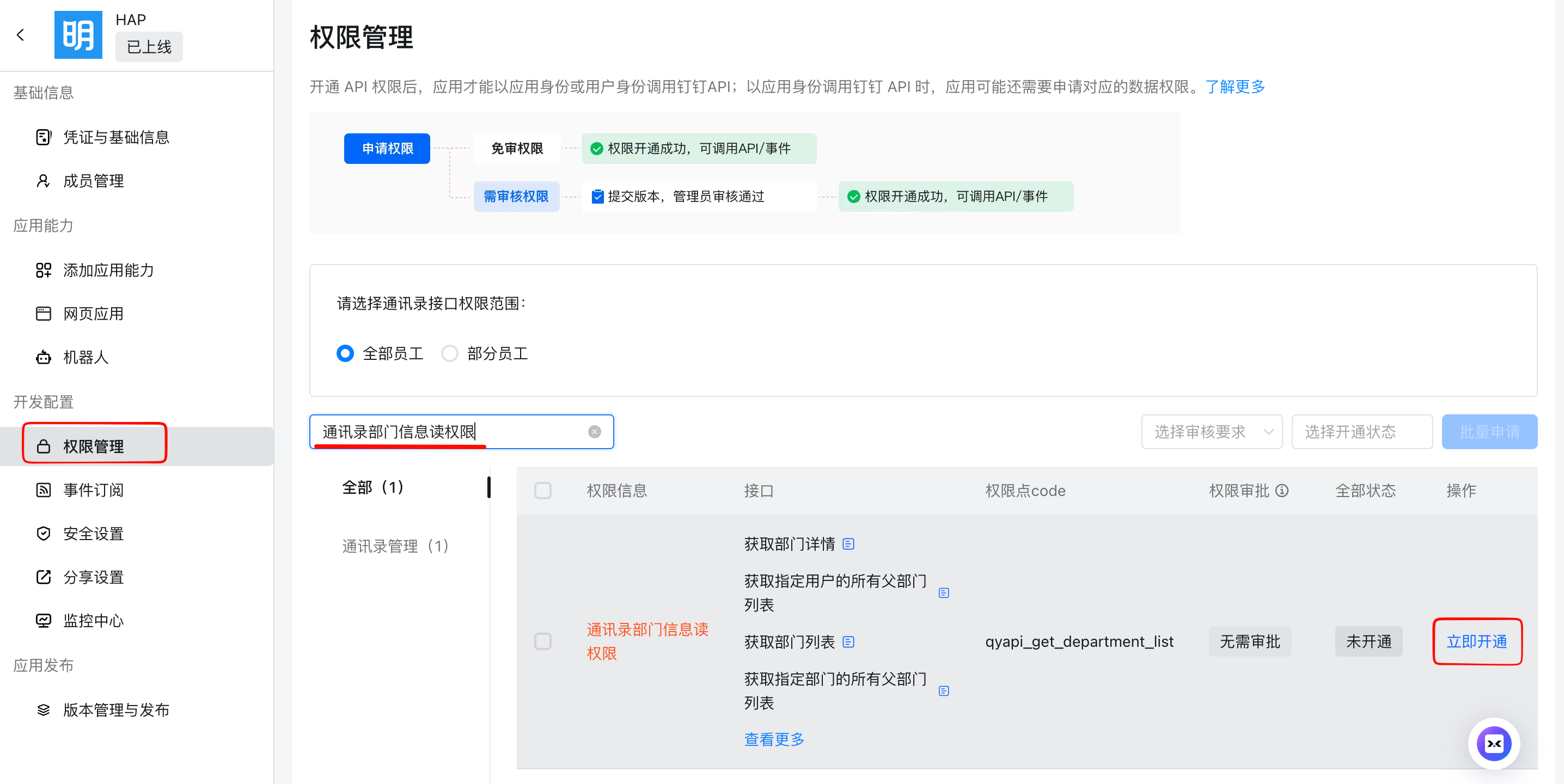 特别重要!在【权限管理】页面中,添加所需的通讯录读取权限。可复制下方权限名称进行搜索,并点击右侧【申请权限】完成授权。