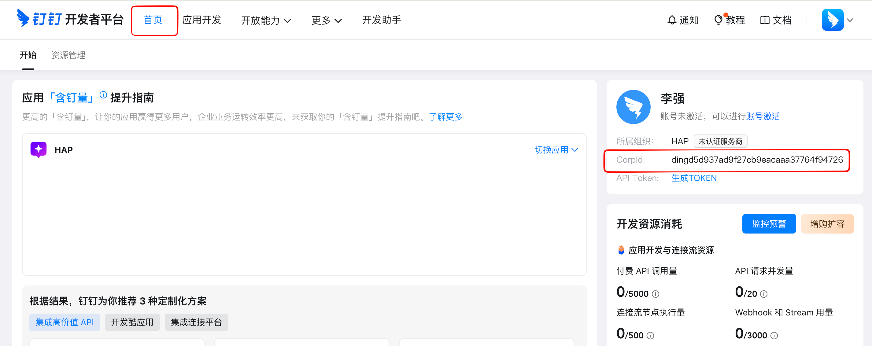组织管理员返回HAP后台的钉钉对接界面,将CorpId等4个对接信息录入。
