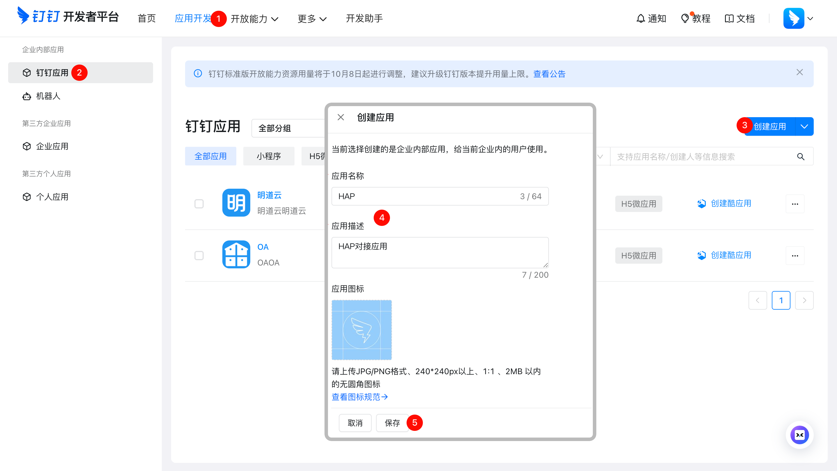 钉钉管理员登录钉钉开发者平台,创建一个企业内部应用。