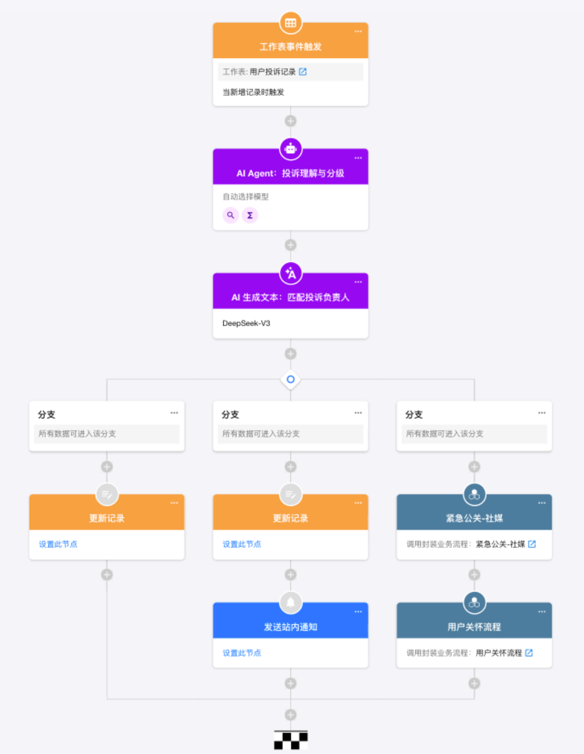 投诉内容被识别、严重程度被判断、不同分支触发不同动作——逻辑清晰、执行可靠。