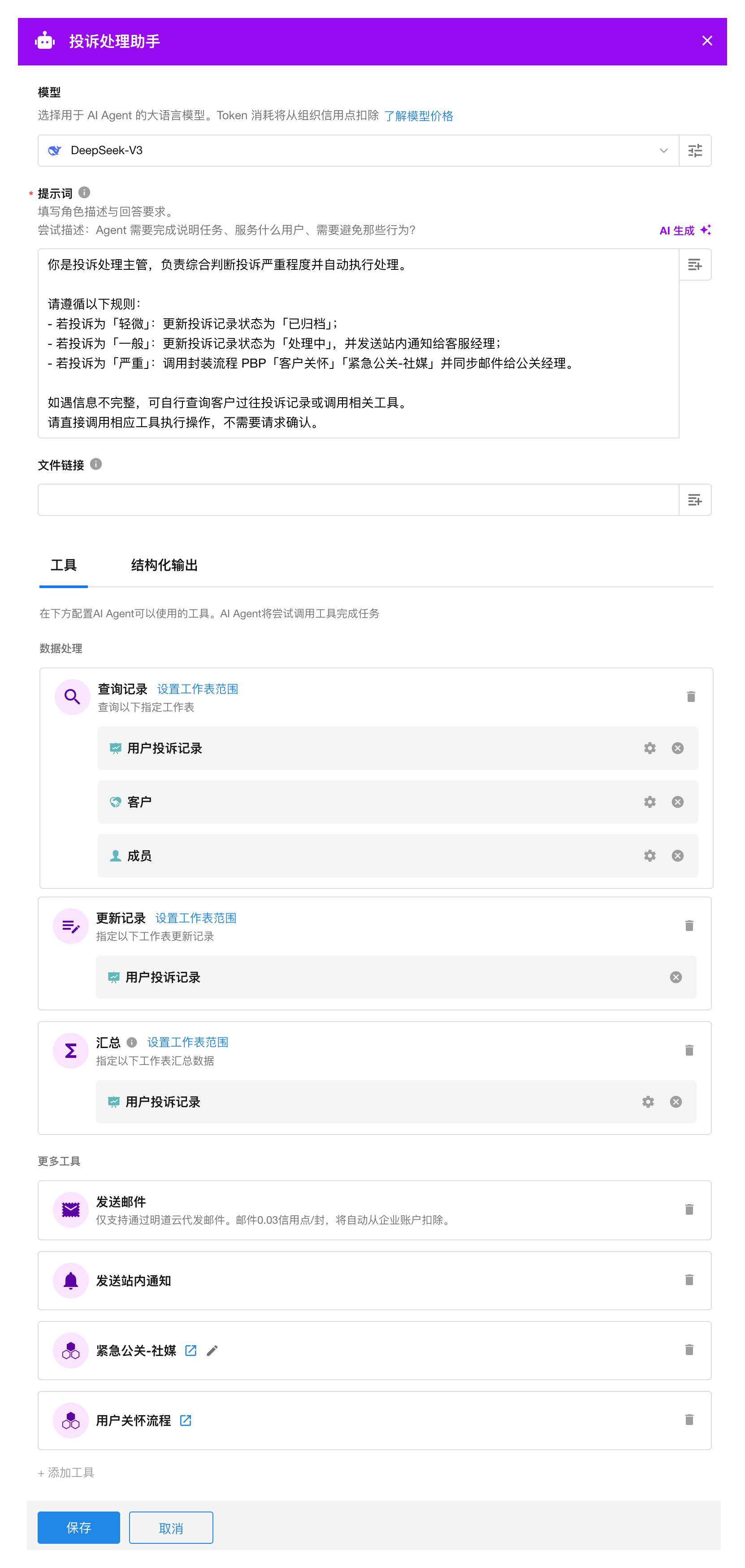 以“客户投诉分级”为场景,演示 AI Agent 节点的应用方式。该思路可用于需要智能判断、自动总结或决策的任意流程。