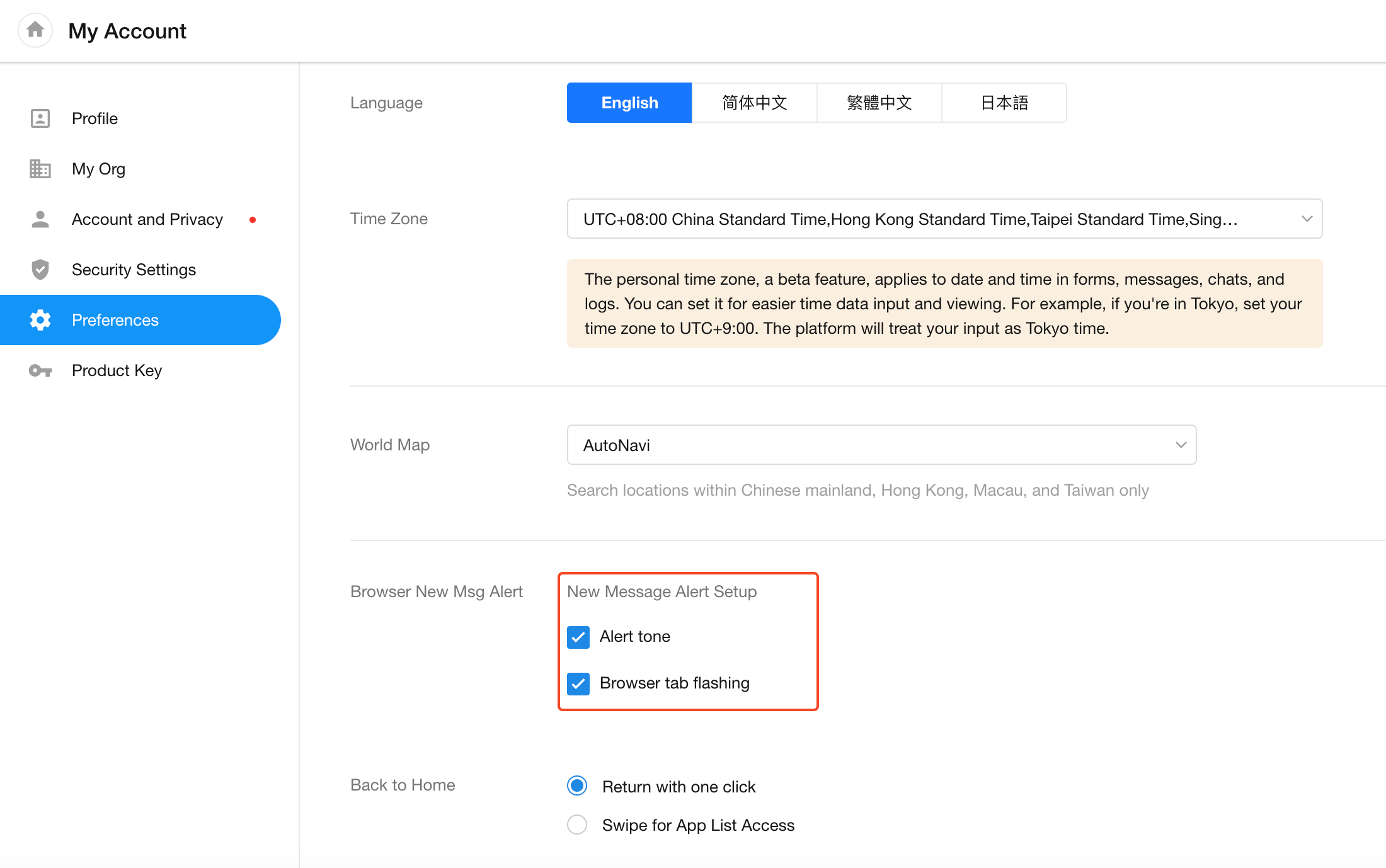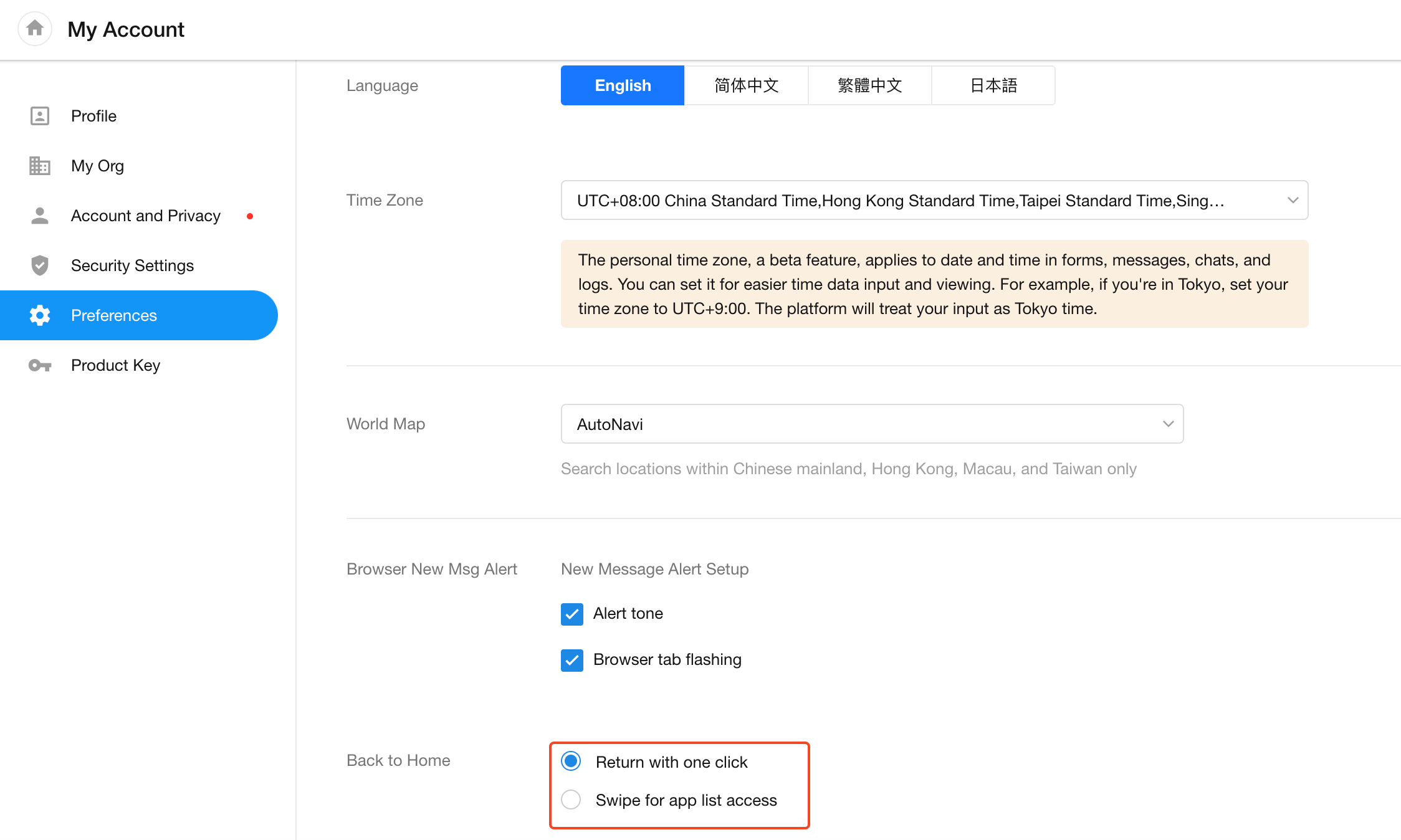 • Preferences: Change system language, select time zone for date and time display, configure browser notification settings, and choose the homepage behavior when navigating within apps.