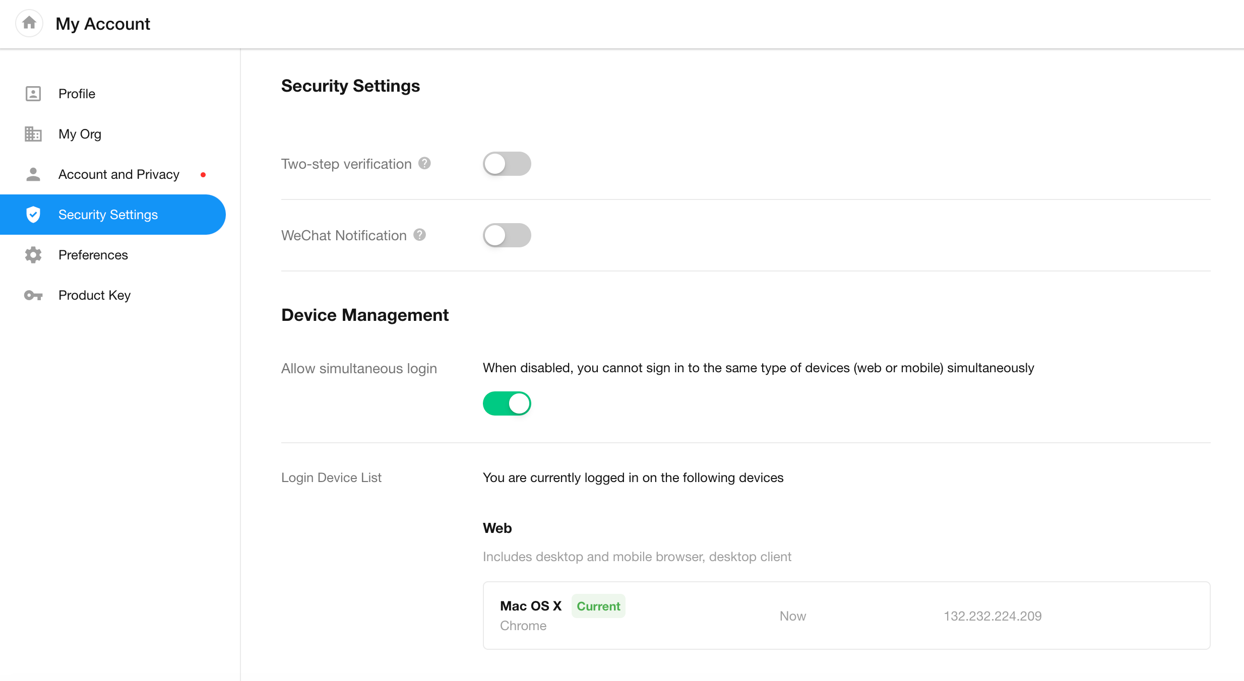 Under the Security Settings tab, you can configure two-step verification, WeChat login notifications, and multi-device login options to keep your account secure.
