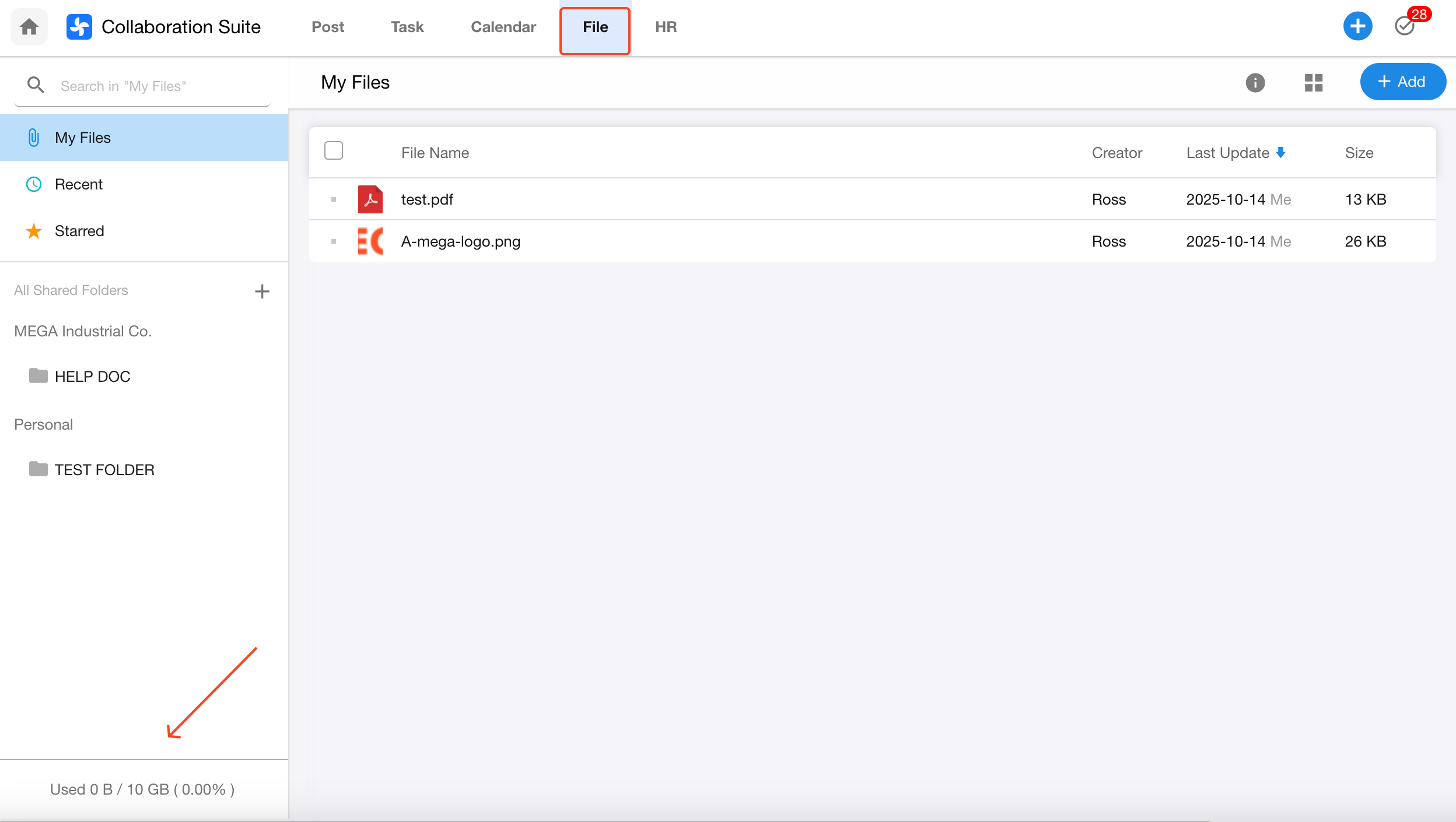 Storage here refers to attachment uploads in collaboration modules like Post, Task, File, and messages.