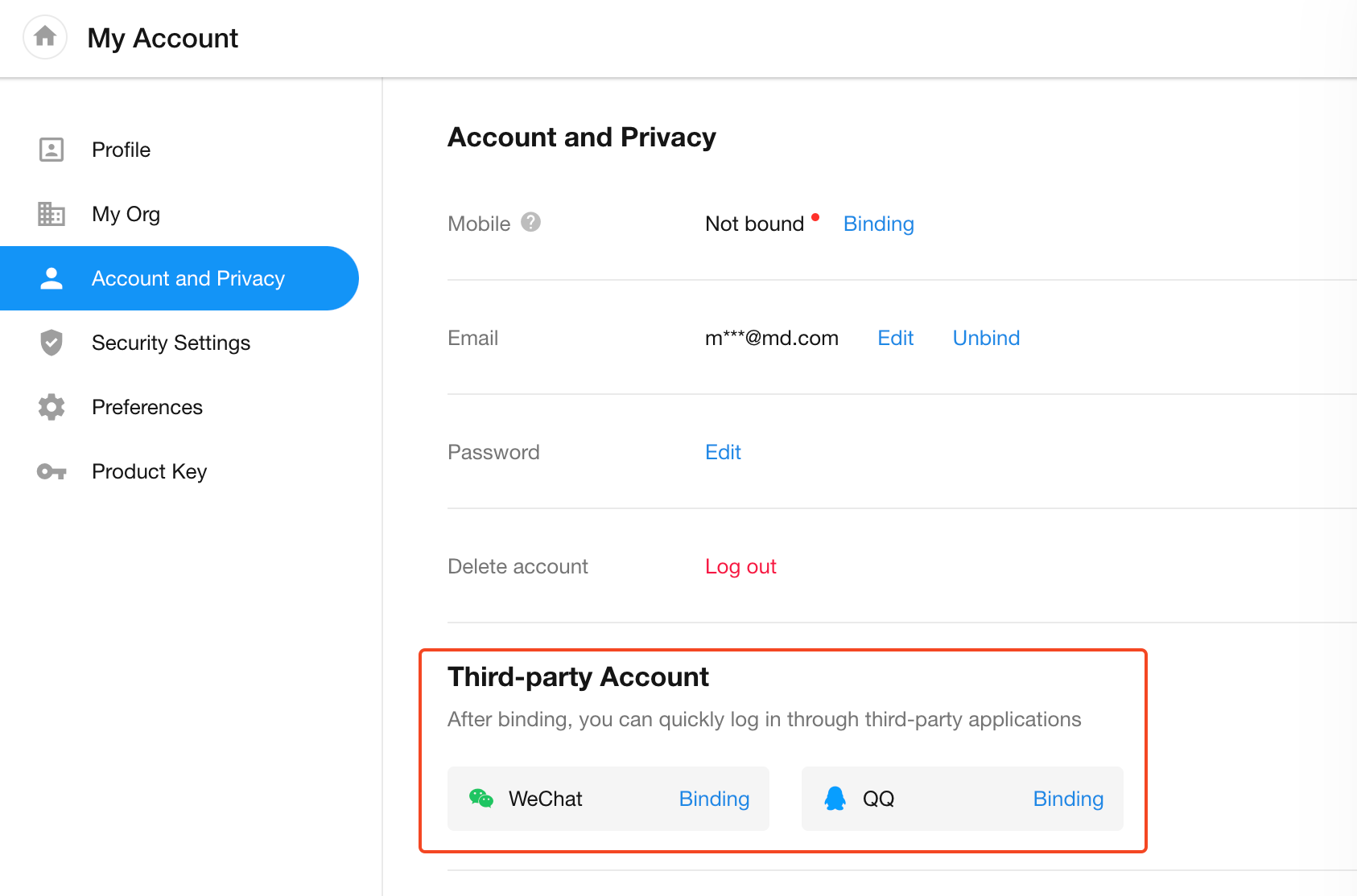 You can bind third-party accounts such as WeChat, QQ, WeCom, Lark, or DingTalk for quick login:
