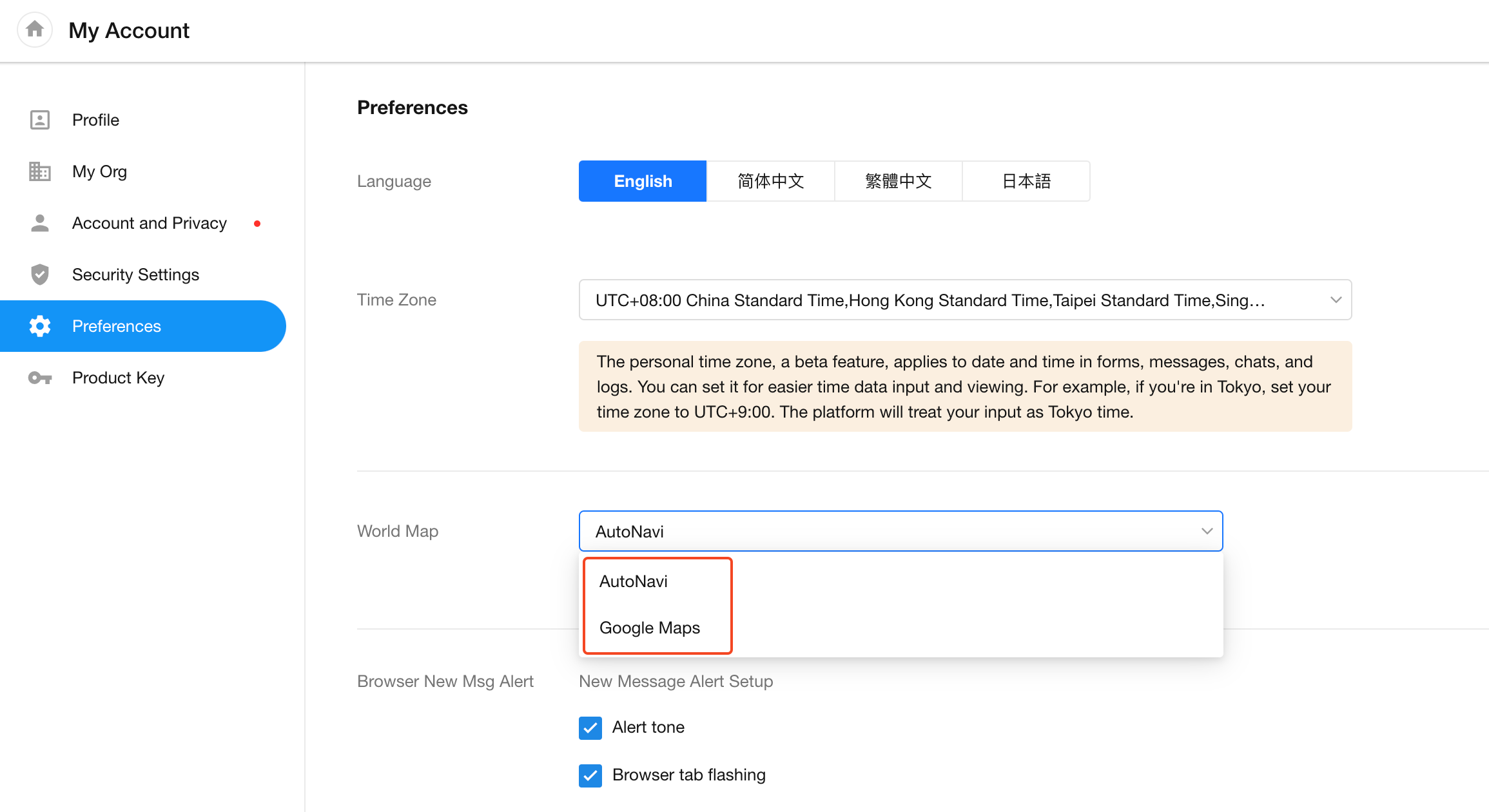Under the Preference tab, you can customize your language, time zone, map display, browser notification preferences, and homepage navigation behavior.