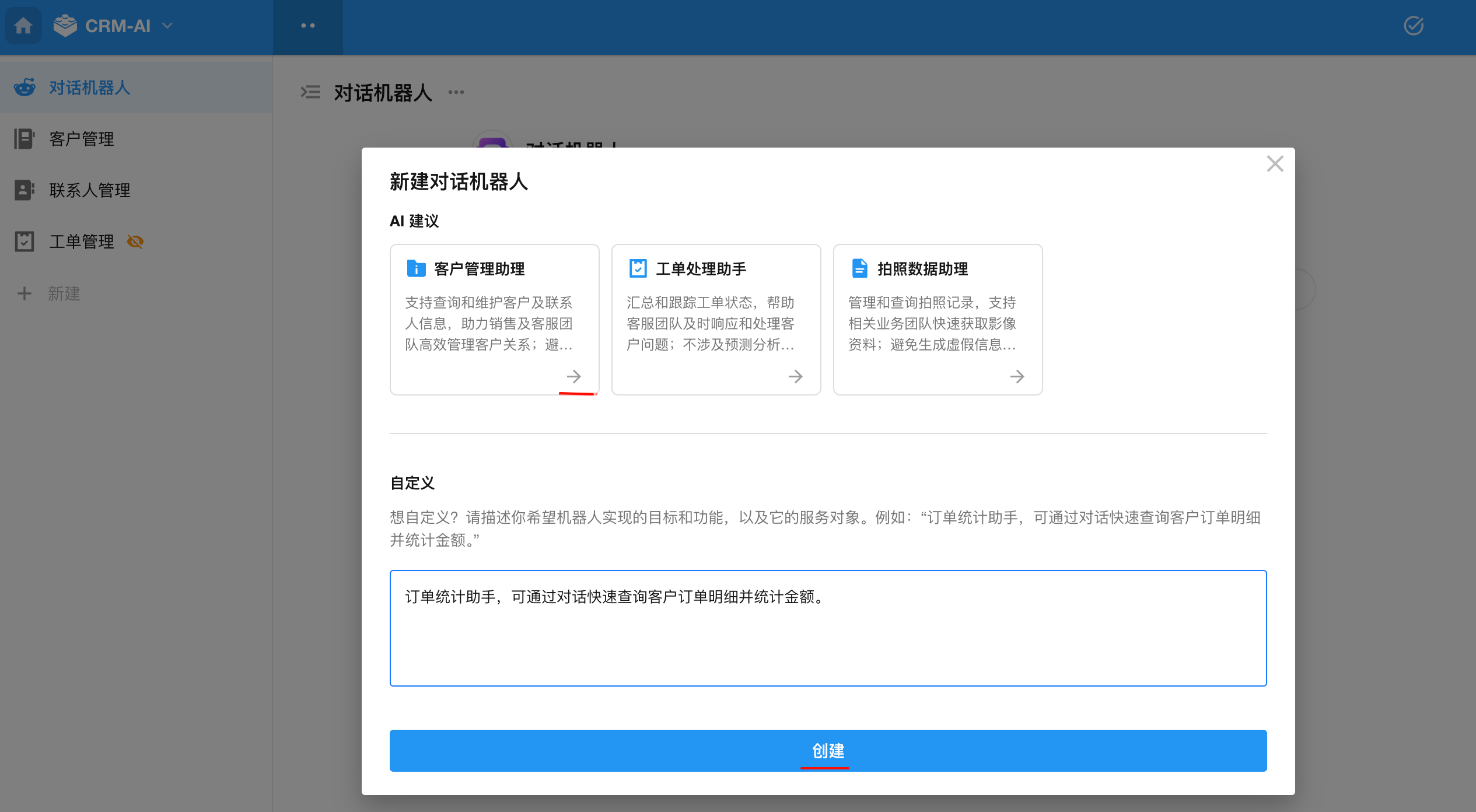 输入对话机器人的目标与功能,也可以选择AI建议的机器人。