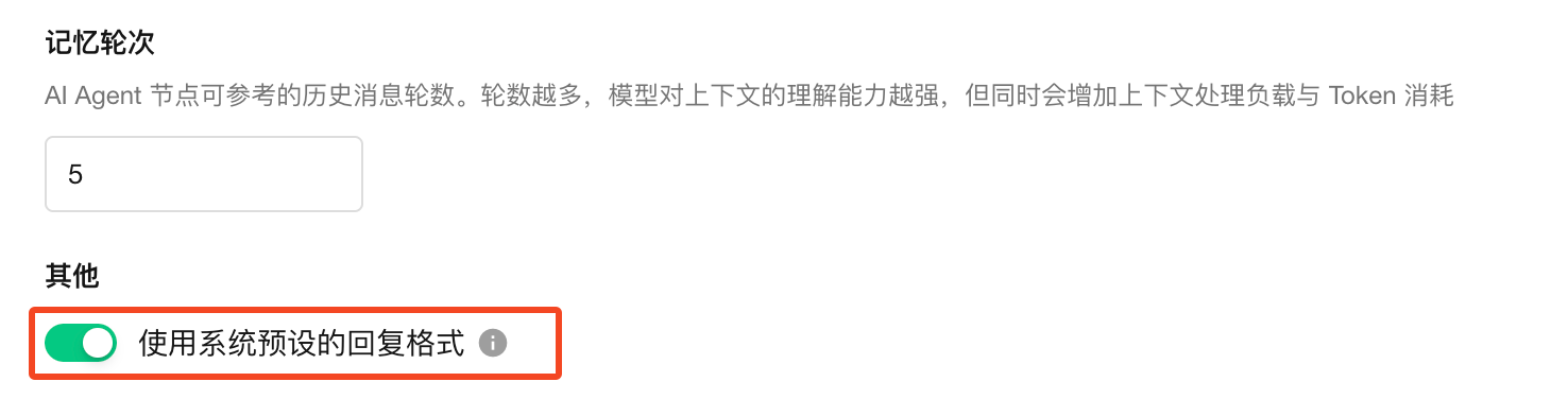 开启"使用系统预设的回复格式"后 ,Agent 按系统预设的语气、格式、结构回复;关闭后可在提示词中约束回复格式。