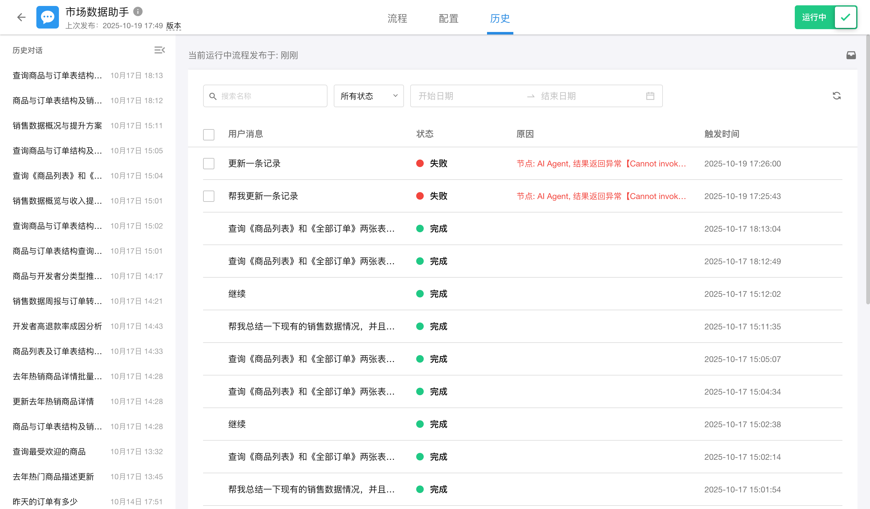 点击任意一条记录, 可进一步查看该轮对话对应的工作流详情。