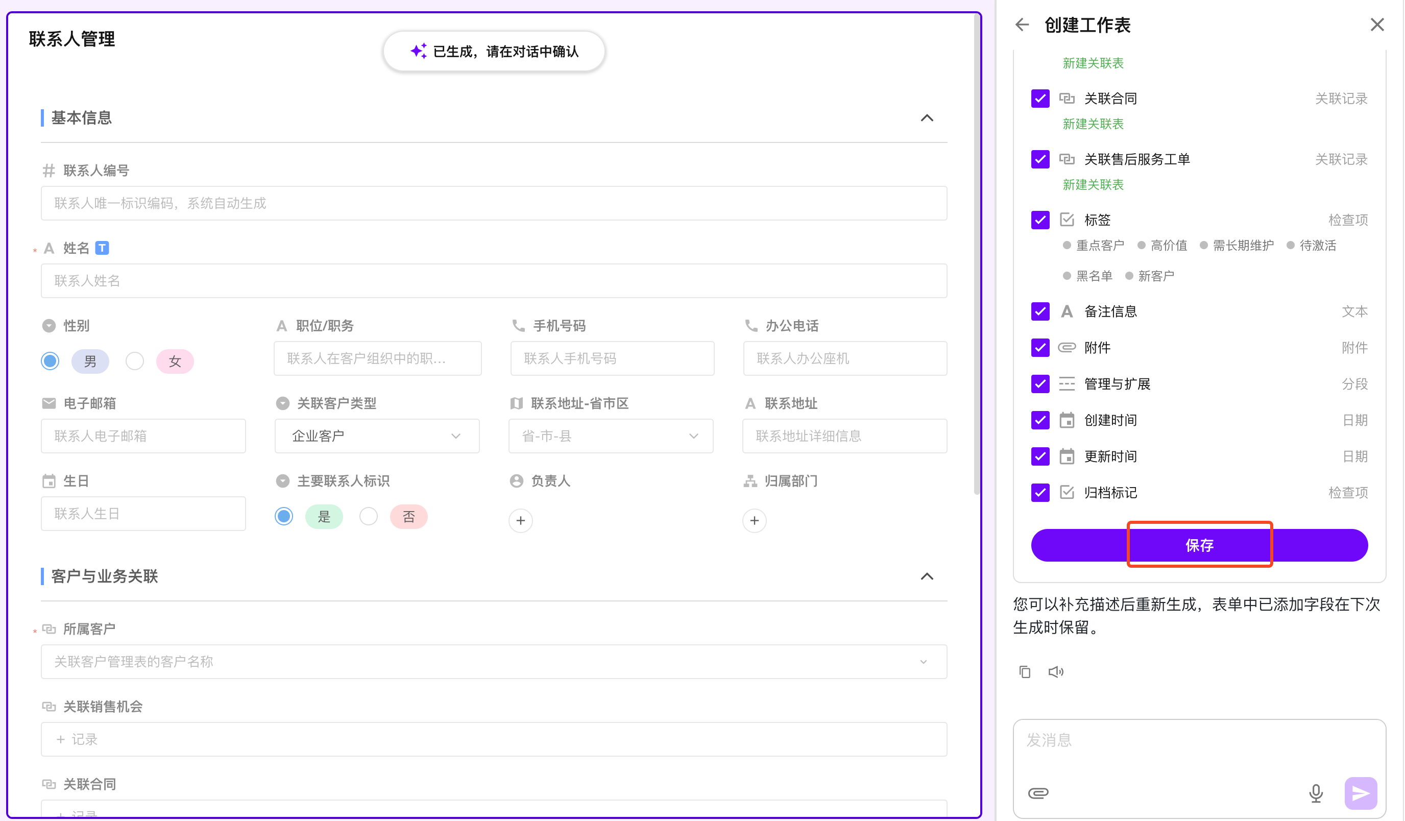 确认创建后,会自动创建相关字段和配置字段属性。点击保存按钮,完成工作表的创建。