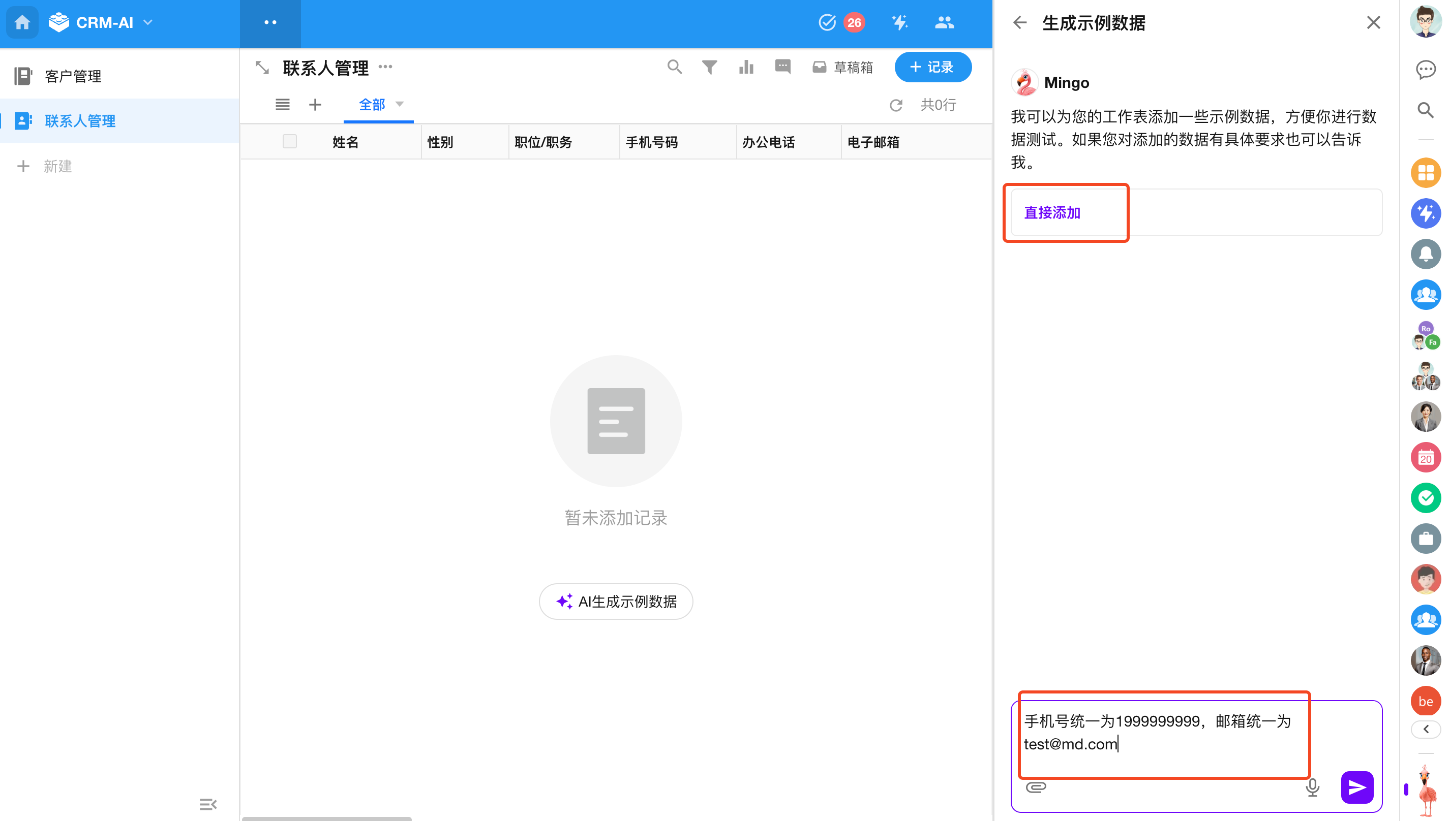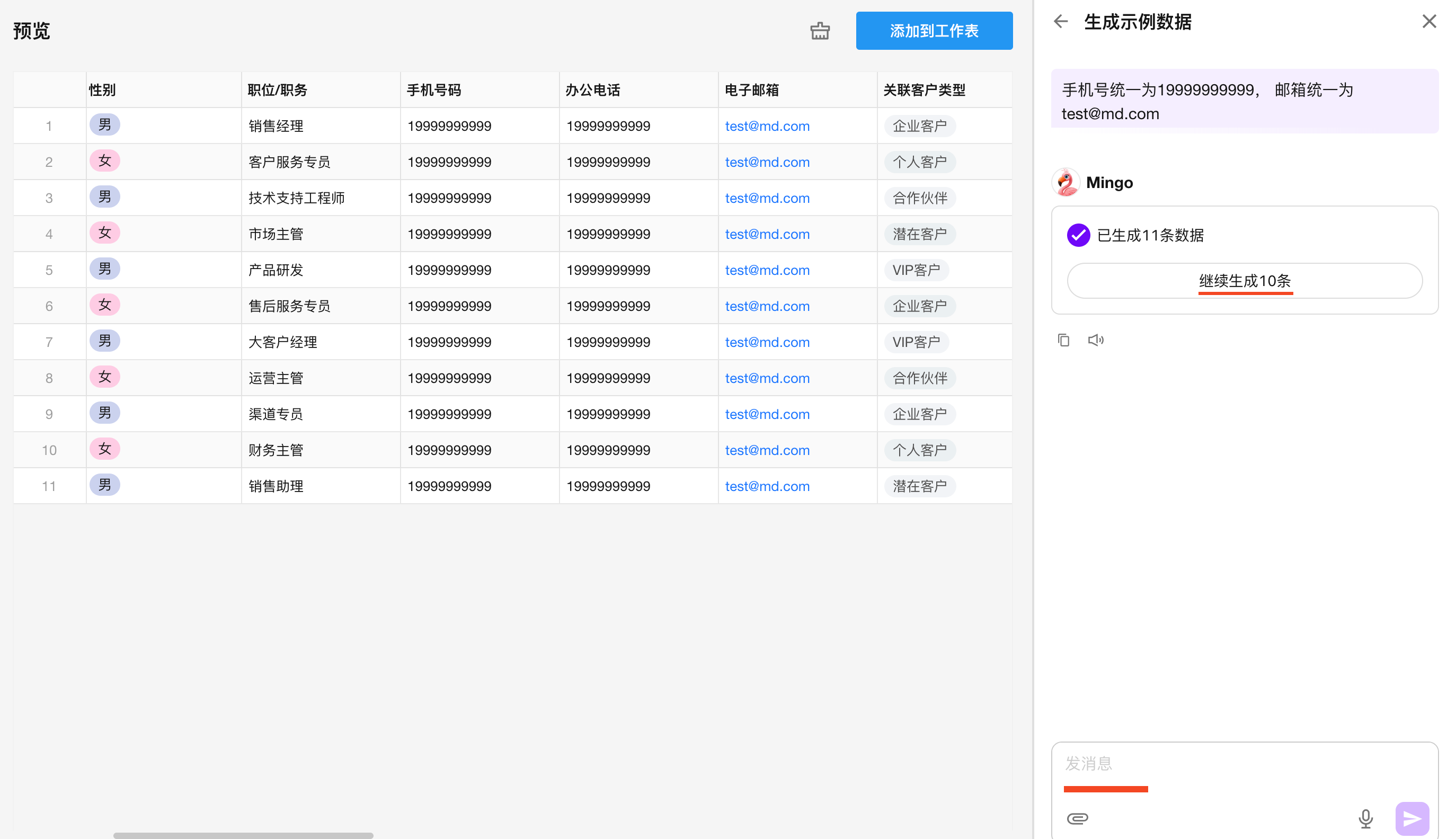 要将生成的数据写入正式记录,请点击“添加到工作表”。 如数据不符合预期,可点击“清空”,再与 Mingo 沟通重新生成。