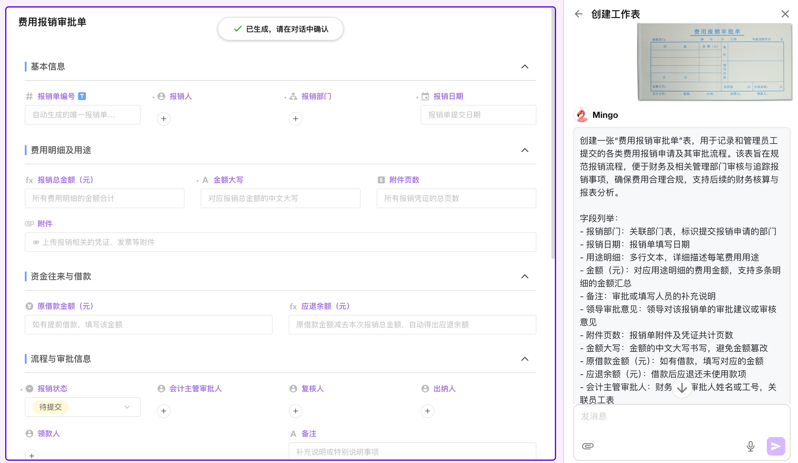 你也可在创建工作表时选择“AI 创建”,系统将自动打开 Mingo 开始创建。