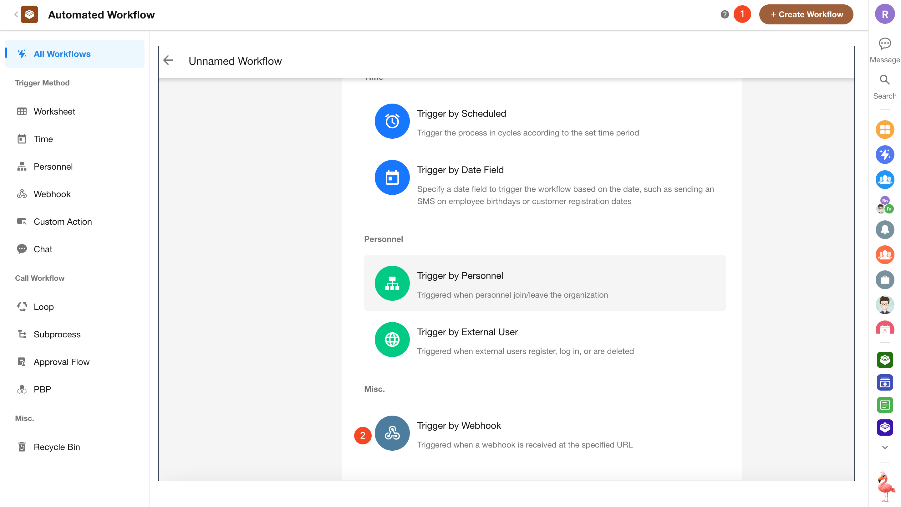 In the application that contains your Orders worksheet, create a workflow triggered by Webhook. This workflow will receive and process incoming data from external systems.