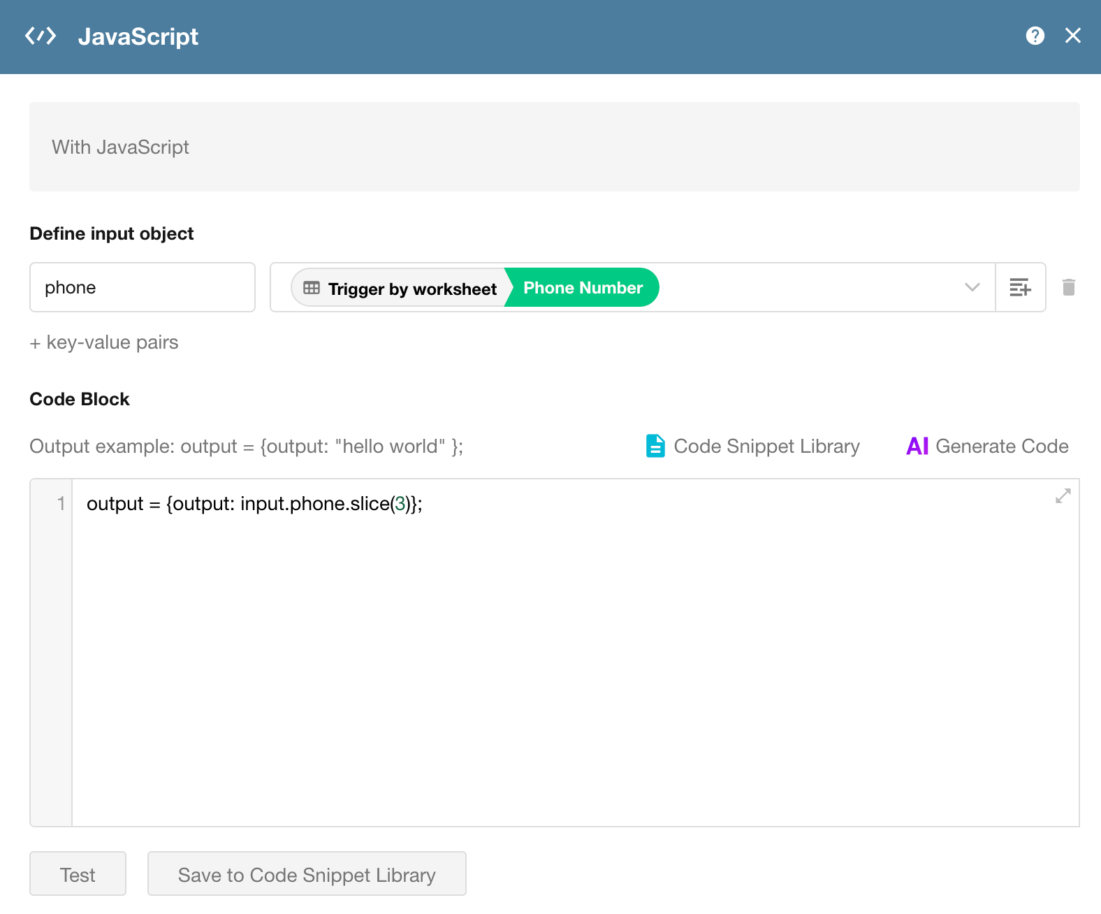 +86country code, which is not supported by this particular API. To handle this, add a Code Block node before the API request node to remove+86.