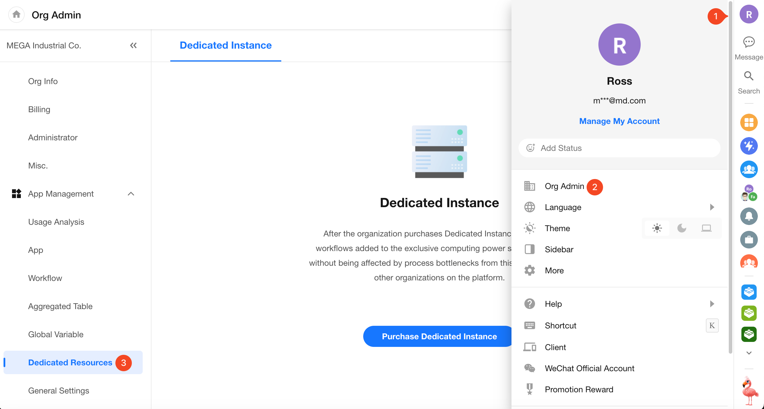 Only Organization Super Admins and Organization Application Admins can purchase and manage dedicated instances via the Organization Admin Console.