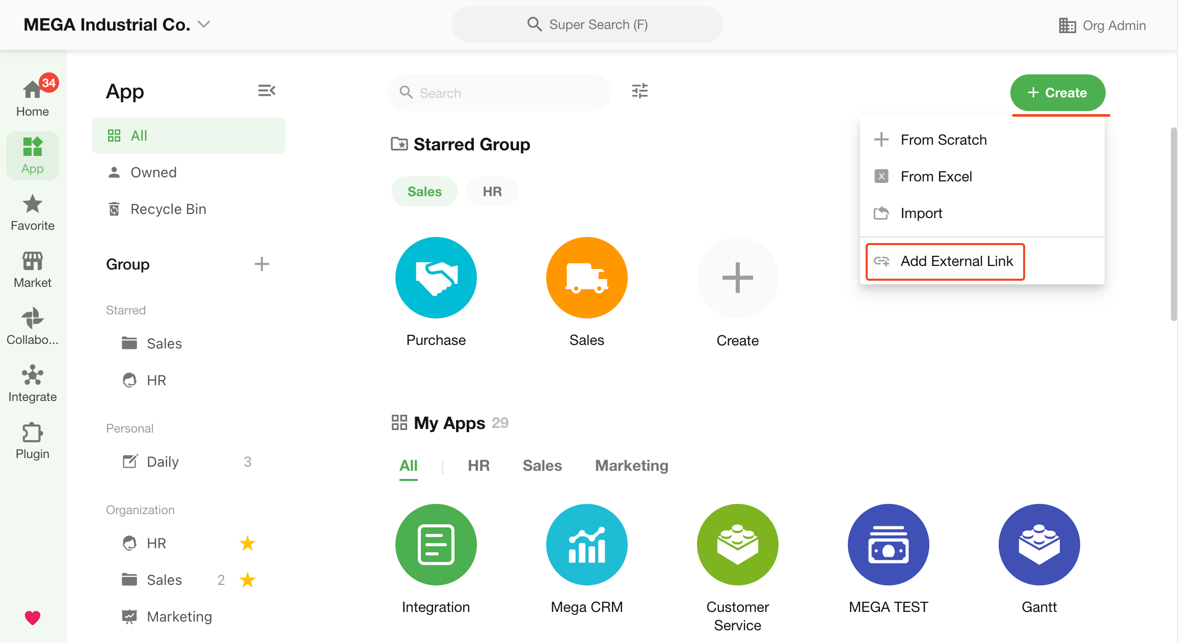 Click Create App and select Add External Link.
