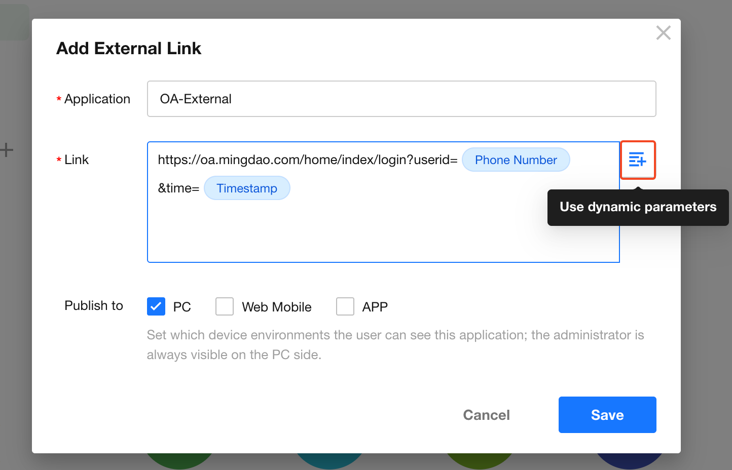 The link supports parameter passing, mainly including user and system information: