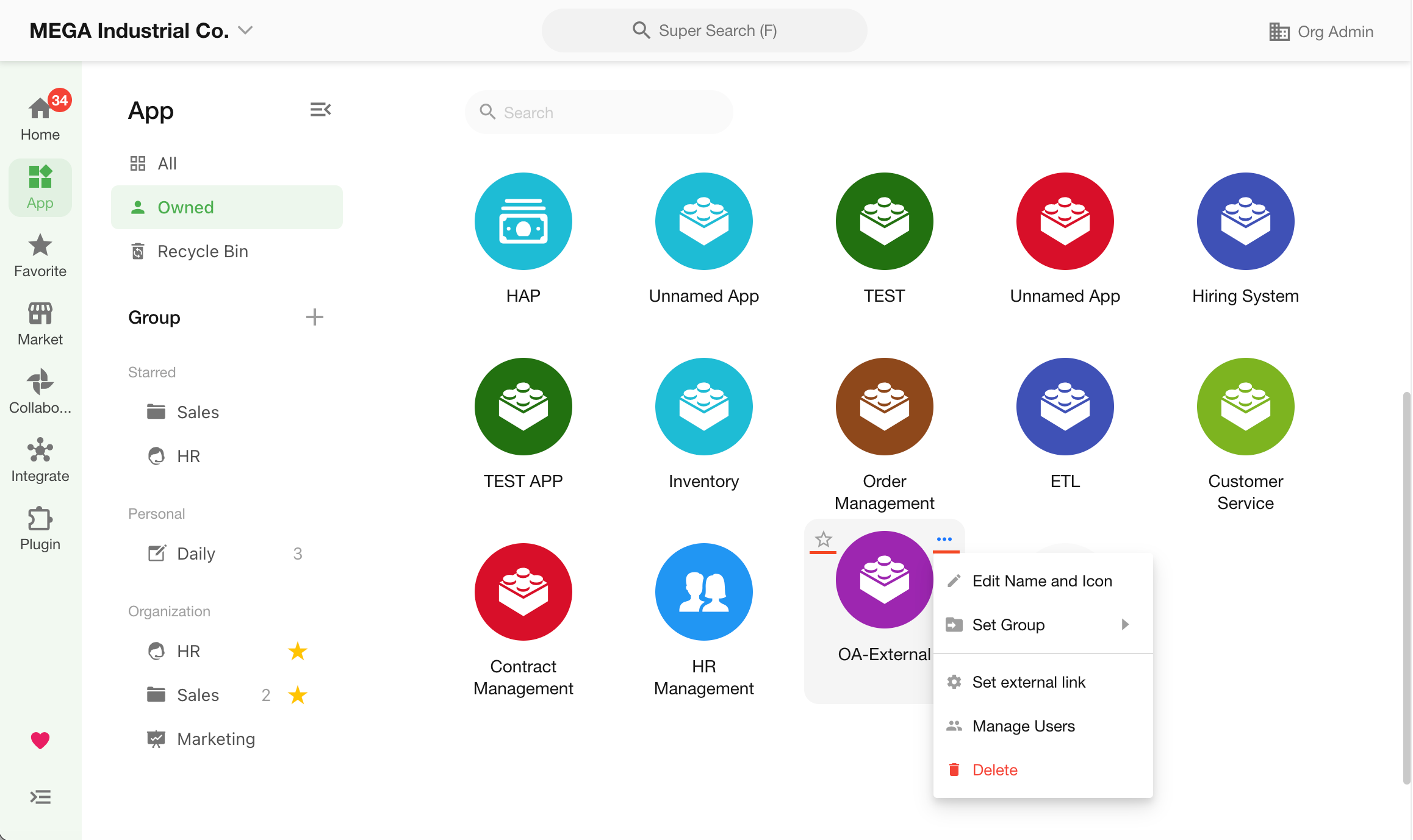After creation, it can be managed like regular applications. You can customize the icon and color, assign groups, mark as favorite (star), or delete.
