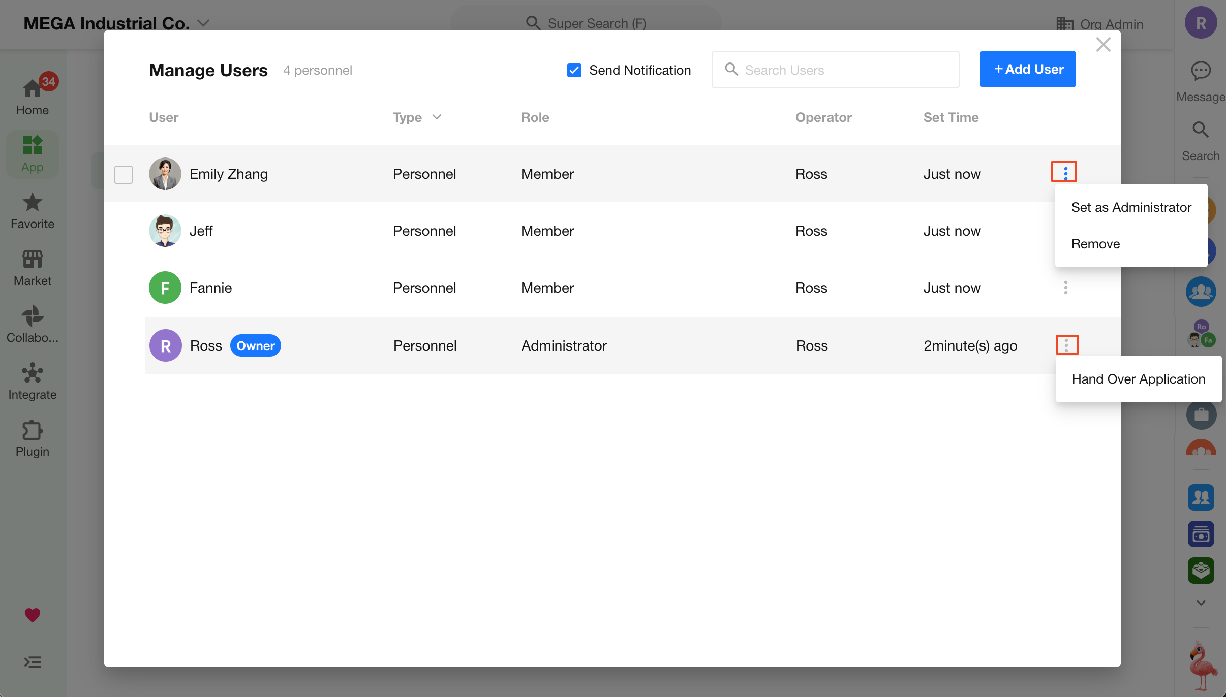 You can configure user roles for external applications, including application admins and regular members.