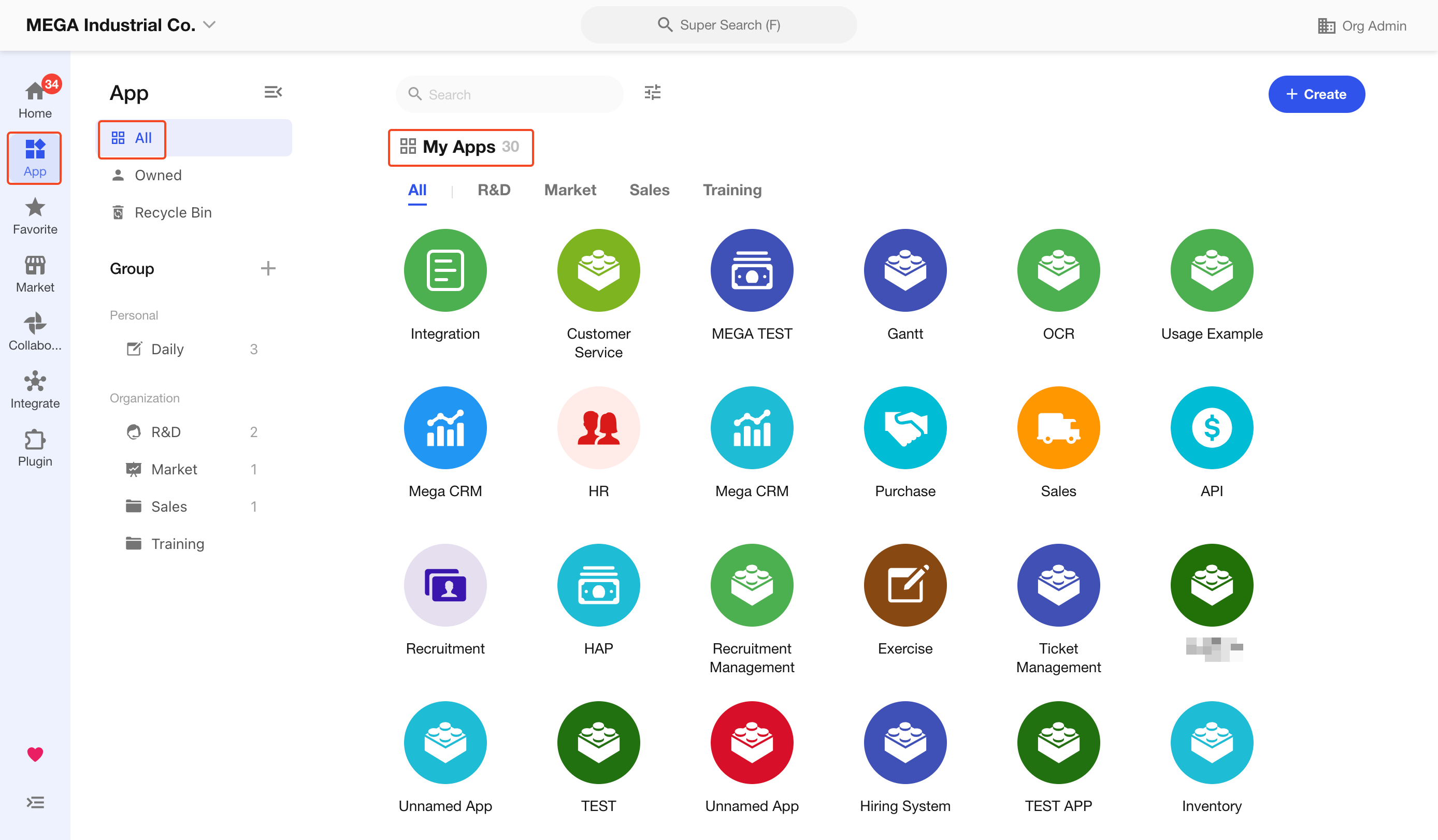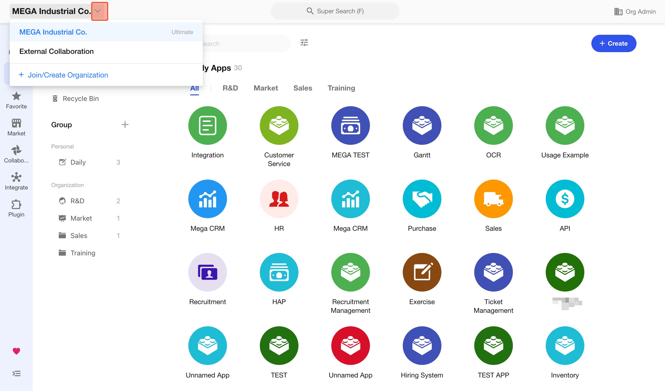 All applications you have joined within the current organization are displayed in a flat list. As shown below, this group displays all applications you have joined in the MEGA Industrial Co. organization.