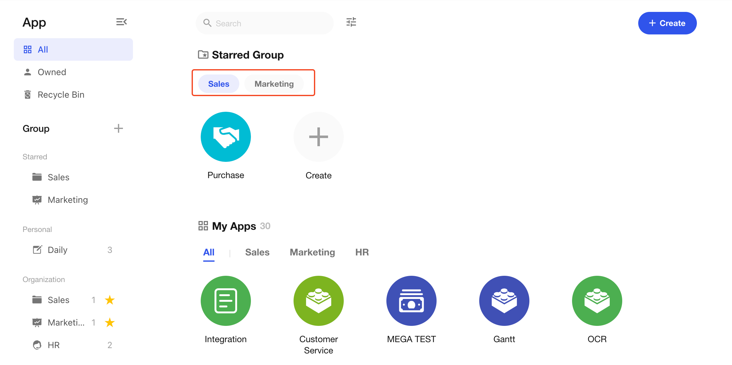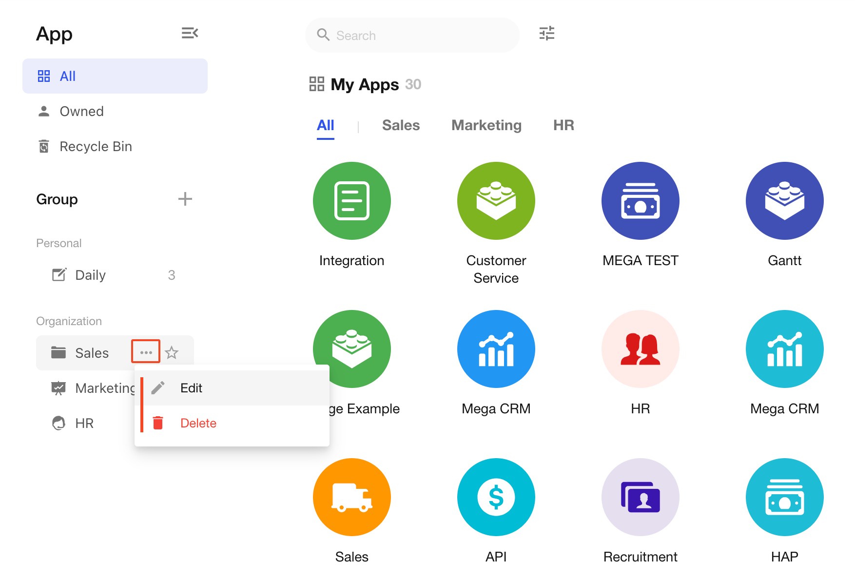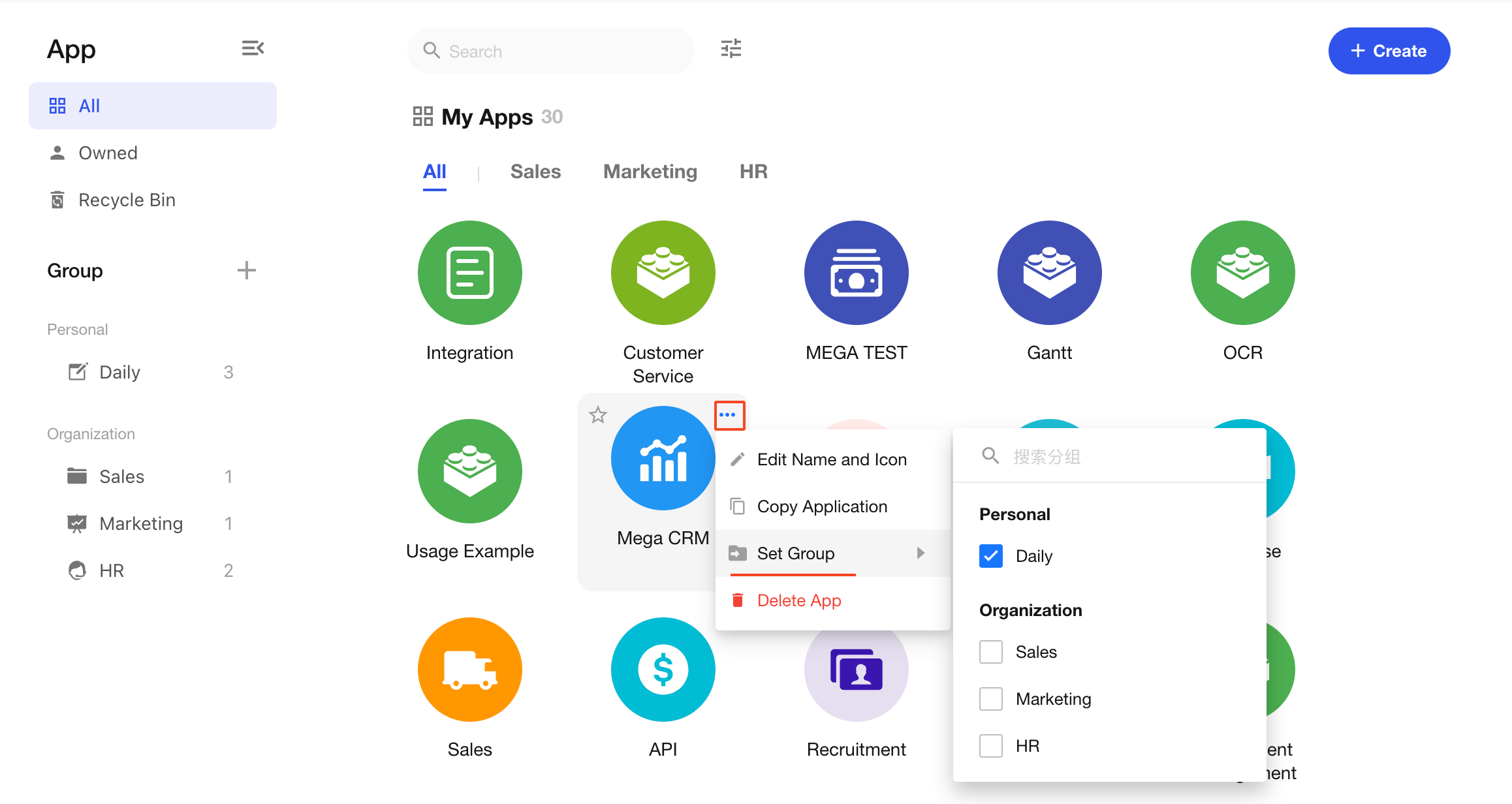 If you have many applications, you can organize them into custom groups—for example, by department, project, or business type—to quickly locate relevant applications.