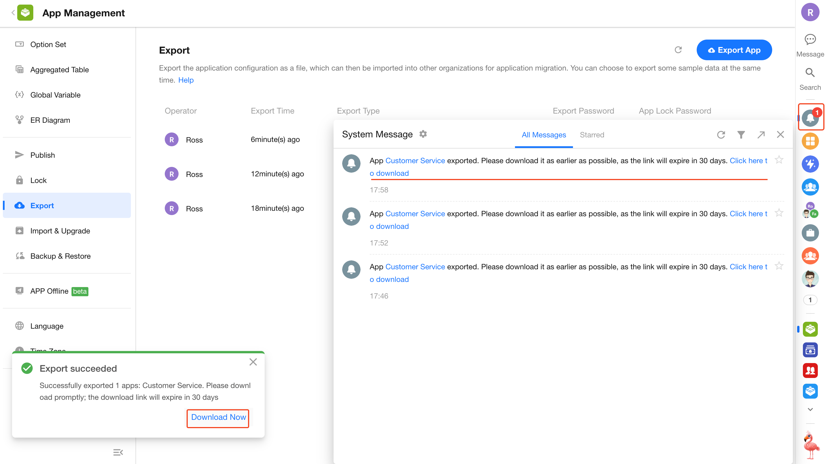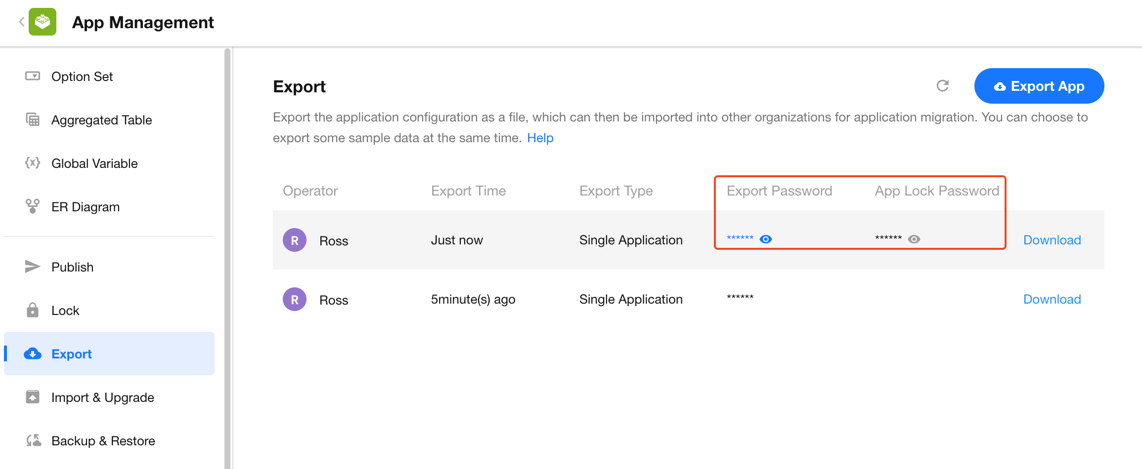 App admins can export the current app directly from the App Management page.