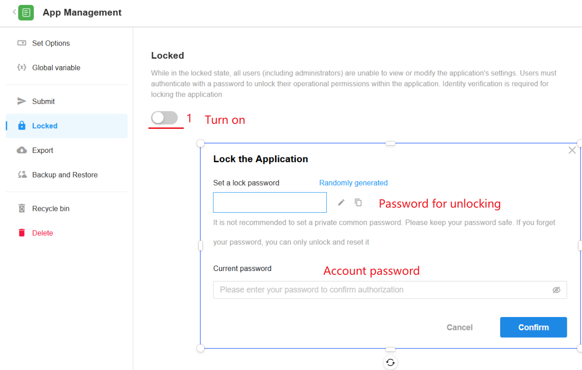 Enable lock > Set an unlock password > Complete identity verification, then click Confirm to finish locking.