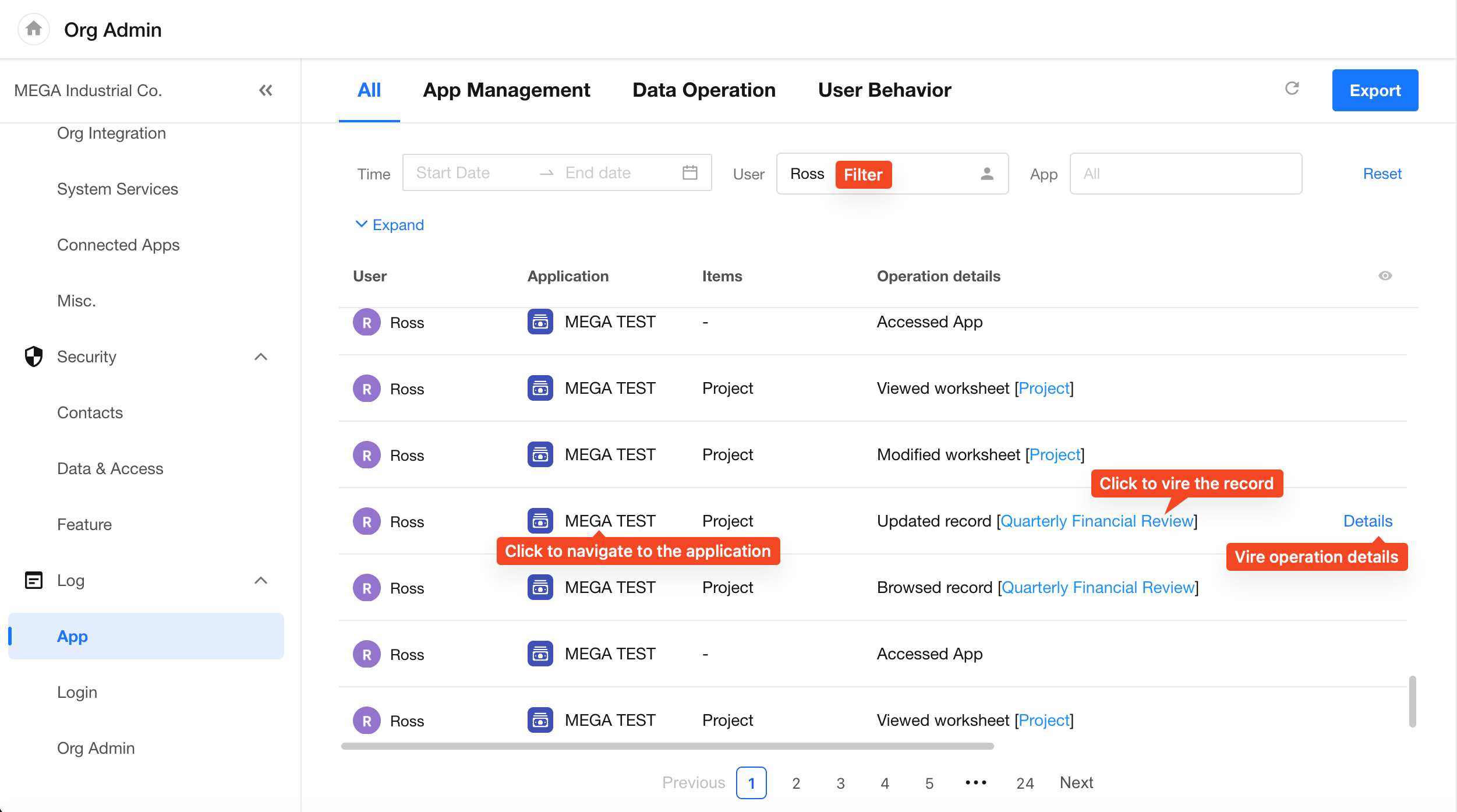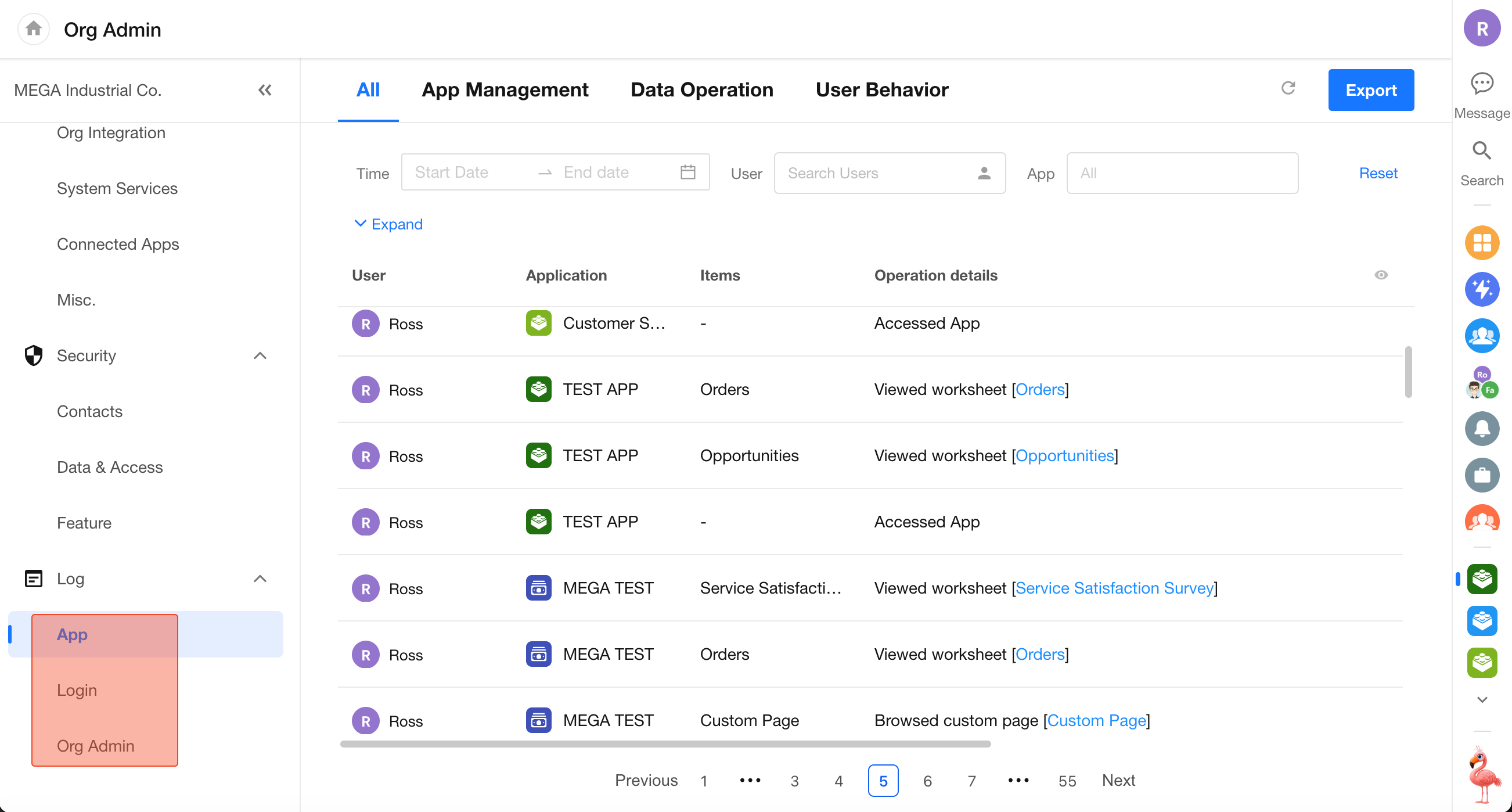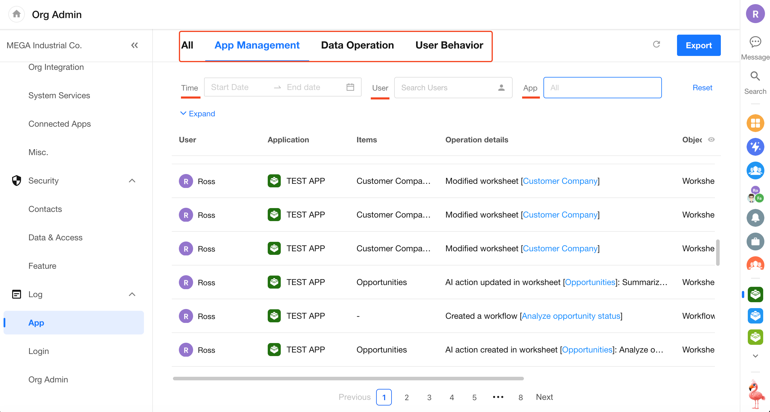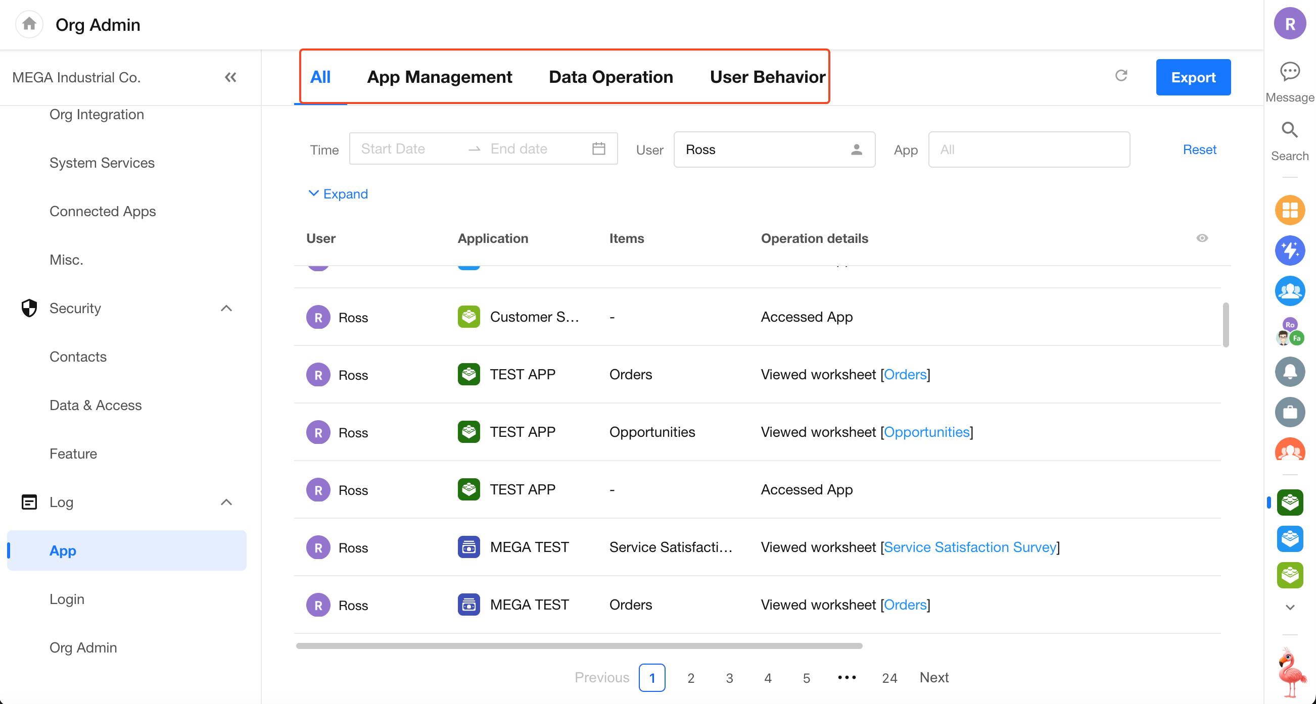Organization administrators can view user activity logs in the Organization Management Console, including application logs and user login logs. These logs help administrators monitor and analyze system activity, and support troubleshooting and security investigations when issues occur.