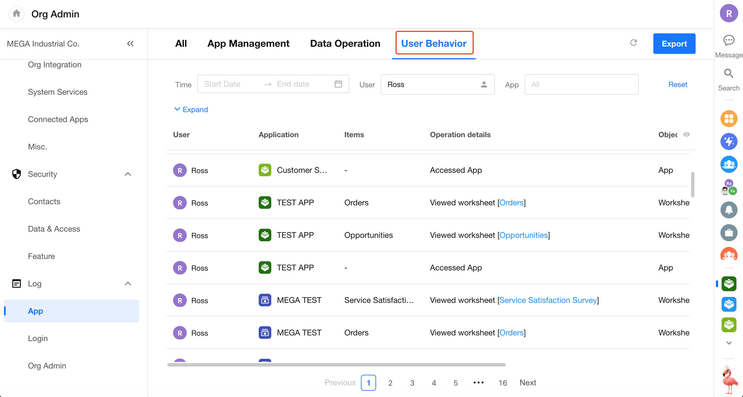 User behavior logs cover actions on applications, worksheets, custom pages, worksheet records, and attachments.