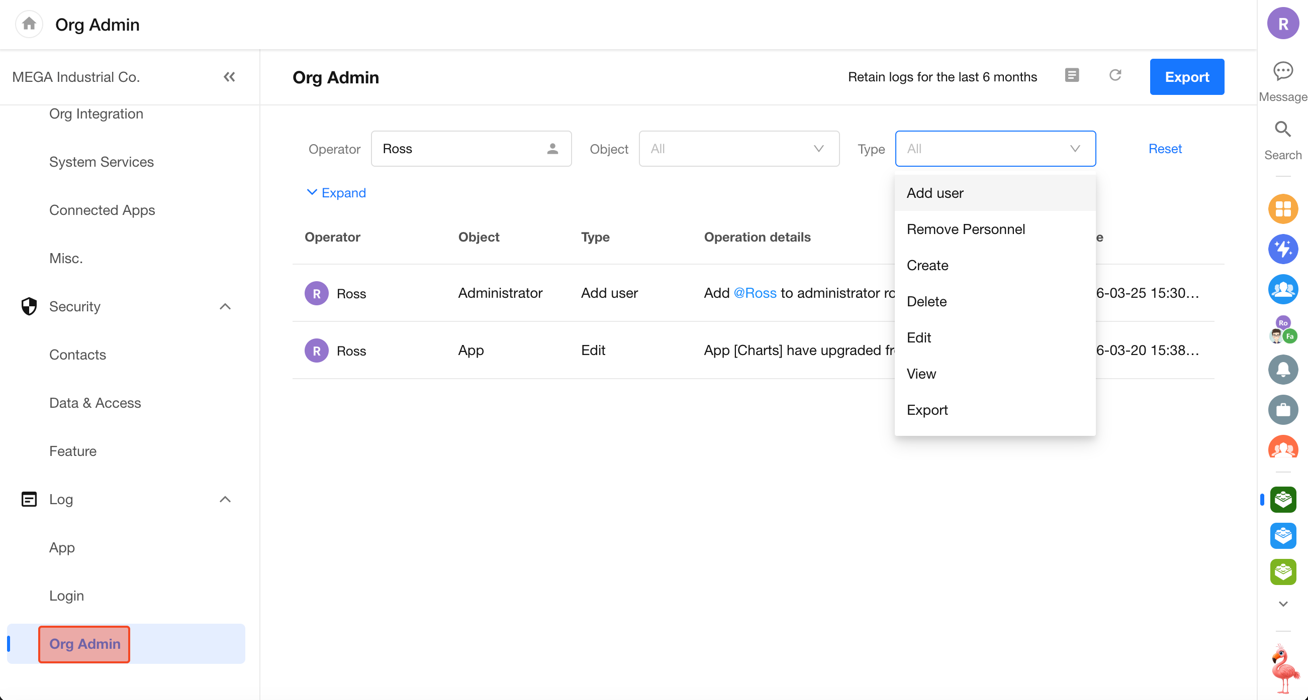 Organization Admin logs in the Organization Management Console record operations performed by administrators, such as assigning or removing organization administrator roles.