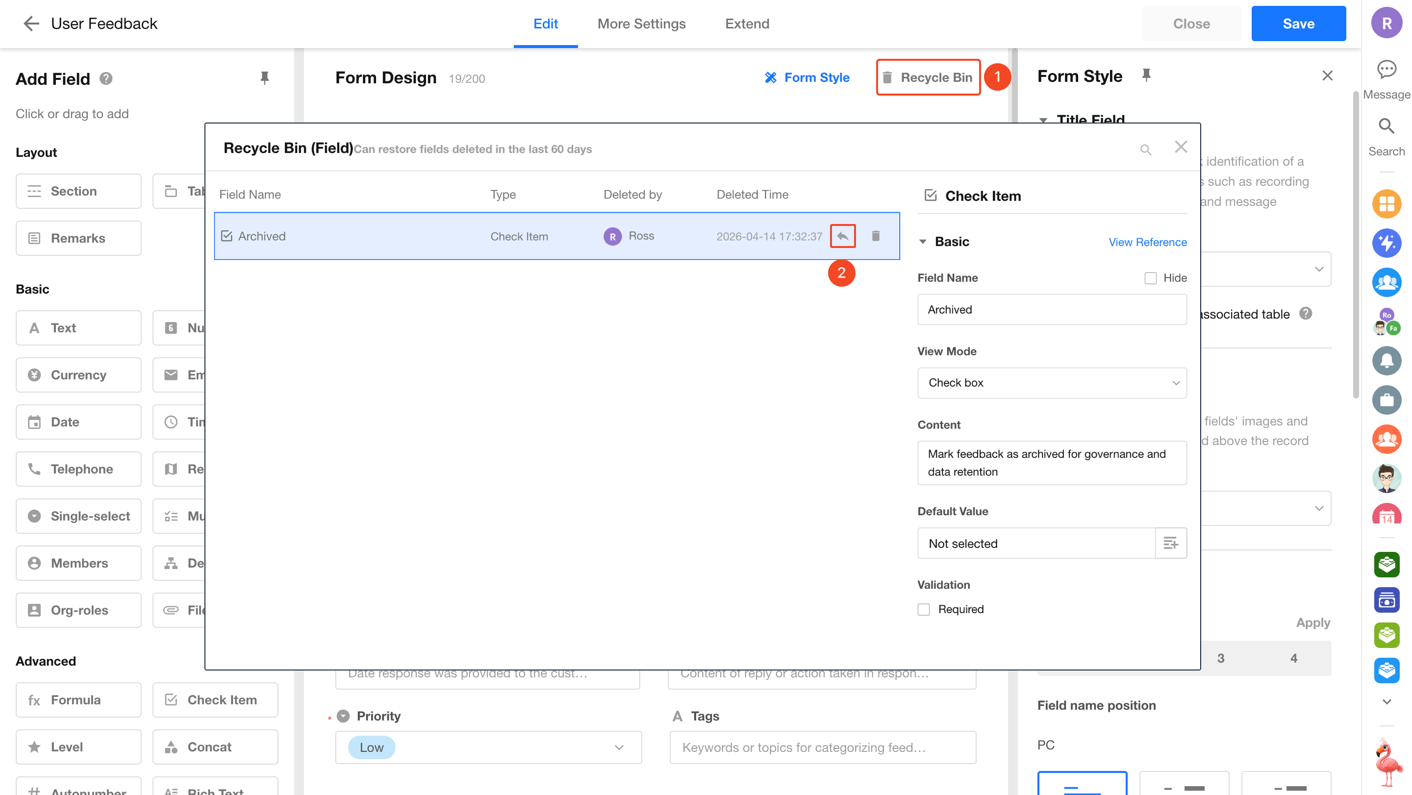 In the form editor, click Recycle Bin in the top-right corner of the design area to restore fields deleted within the last 60 days.