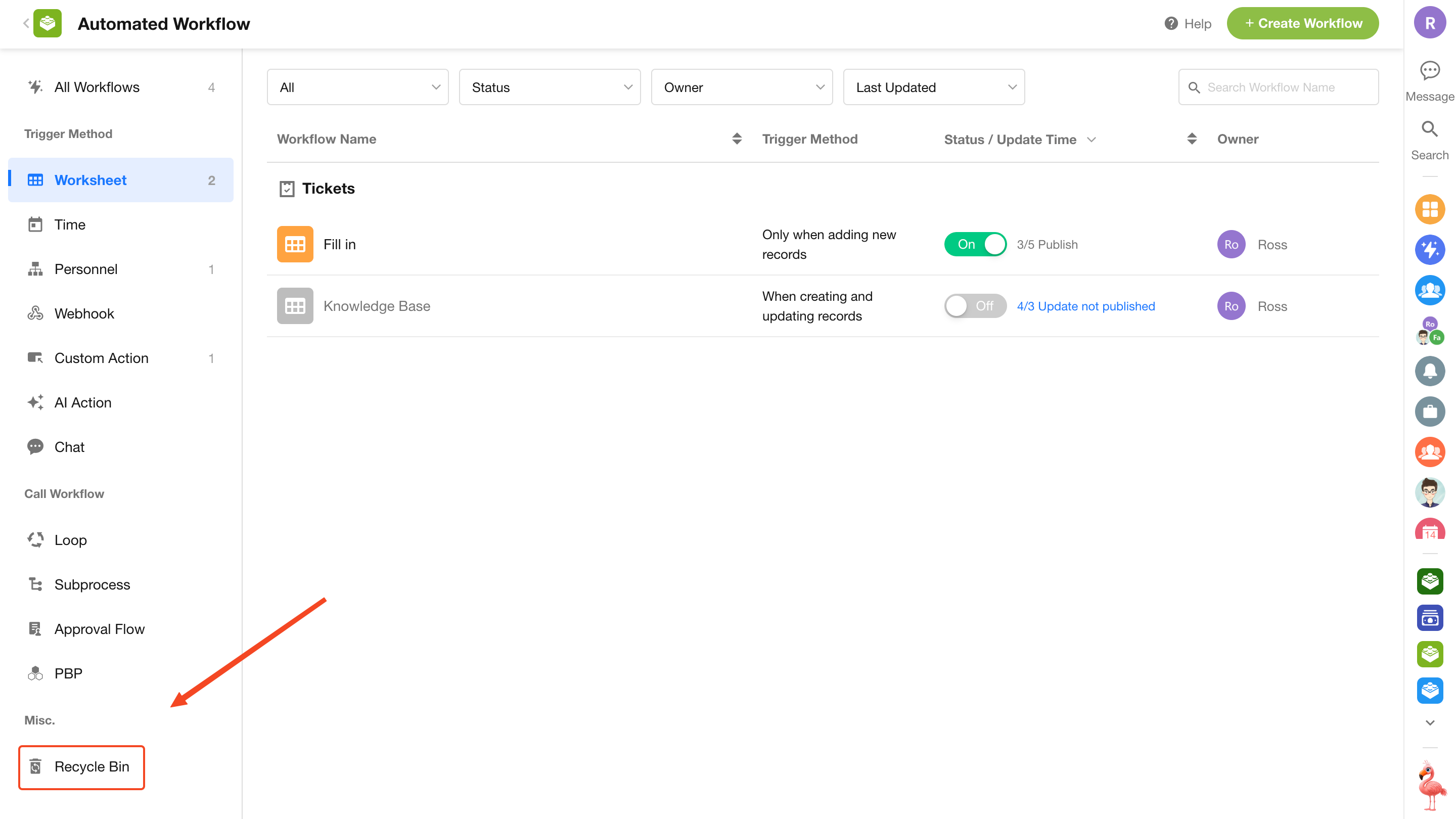 - The workflow recycle bin is available in paid editions only.