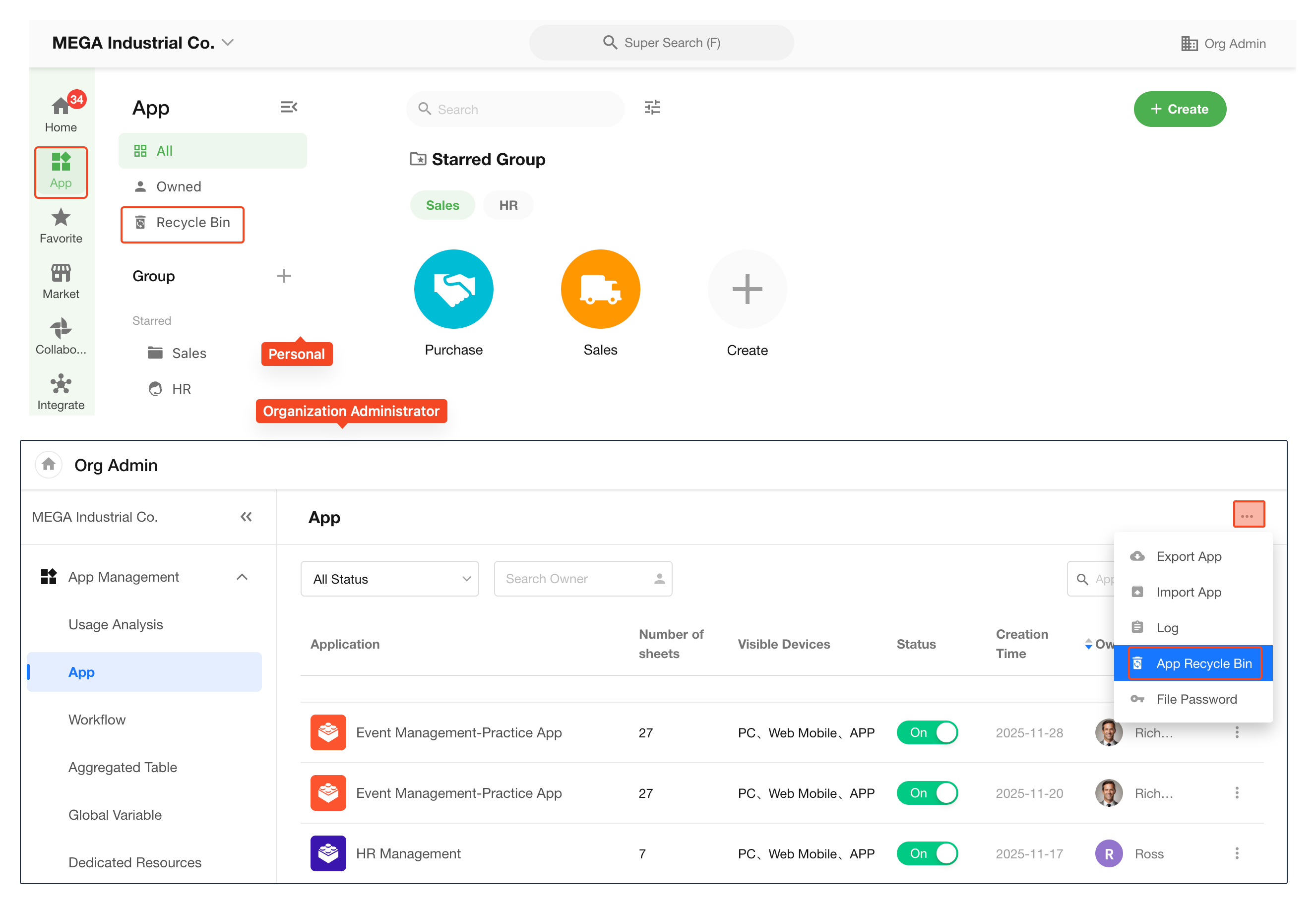 - Organization Super Admins and Application Admins: In the Organization Admin Console, go to App Management > App > More > App Recycle Bin