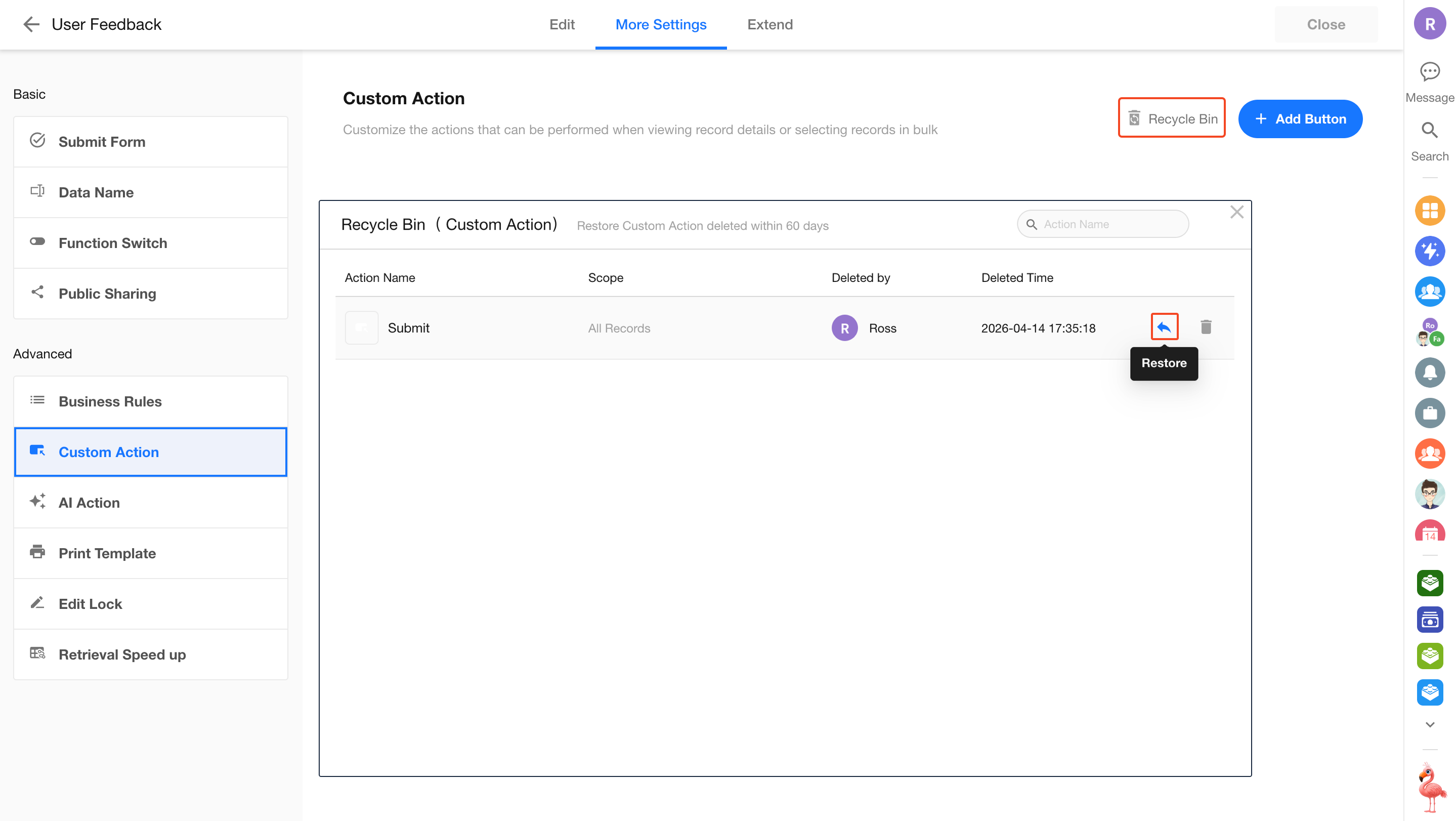 On the custom action management page of a worksheet, click the Recycle Bin button at the top to restore deleted actions.