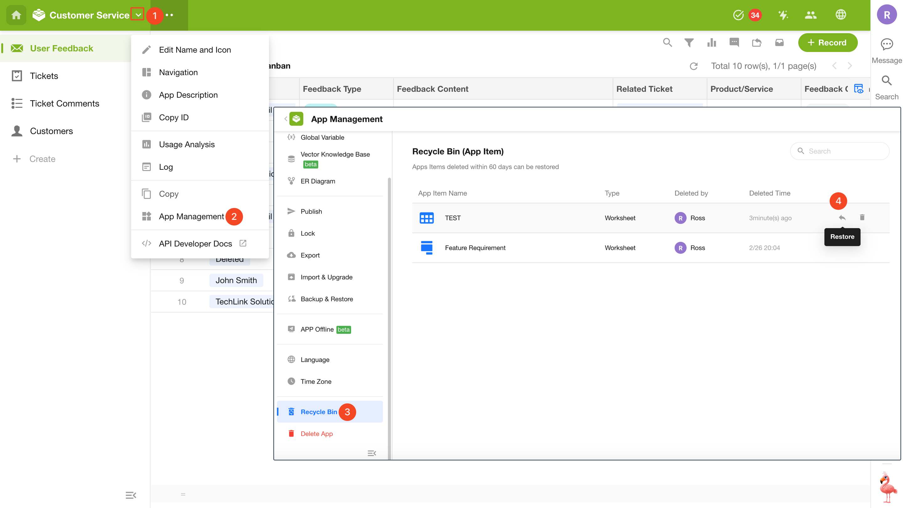 Application admins can go to App Management > Recycle Bin to restore or permanently delete worksheets and custom pages.