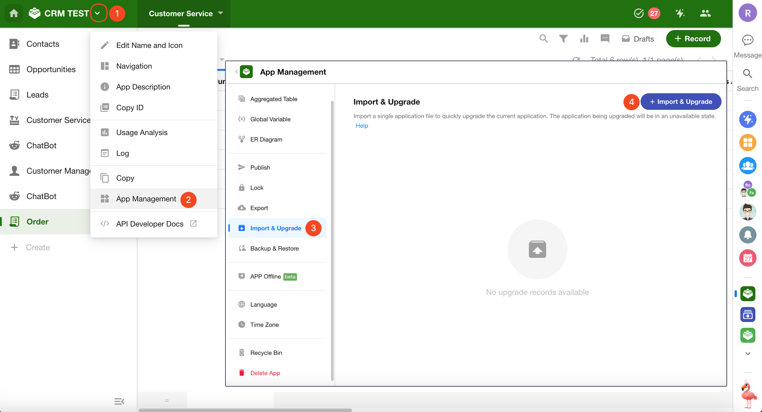 The Application Admin can navigate to the App Management page and select Import & Upgrade to access the Import and Upgrade button.