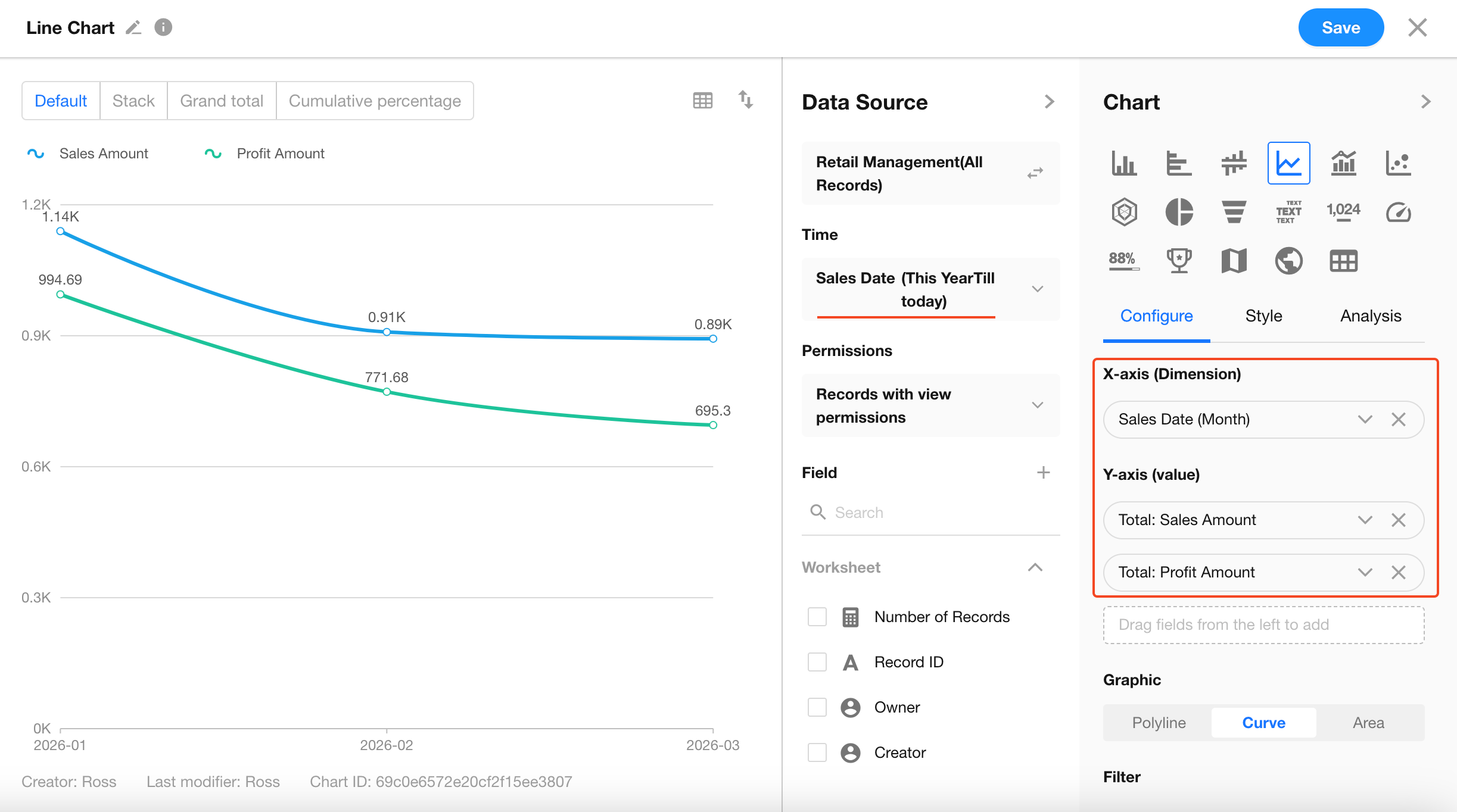 - Multi-metric comparison: Compare trends of metrics such as sales and profit within the same chart.