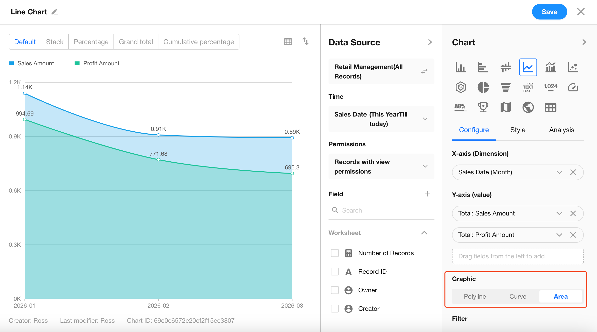 When Area is selected, the space beneath the line is filled with color.Suitable for emphasizing the scale or cumulative magnitude of values.