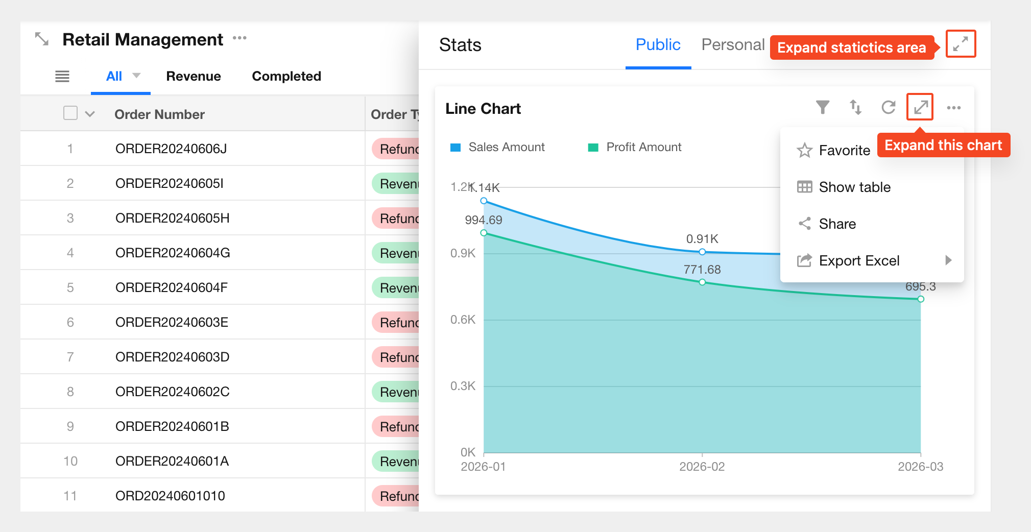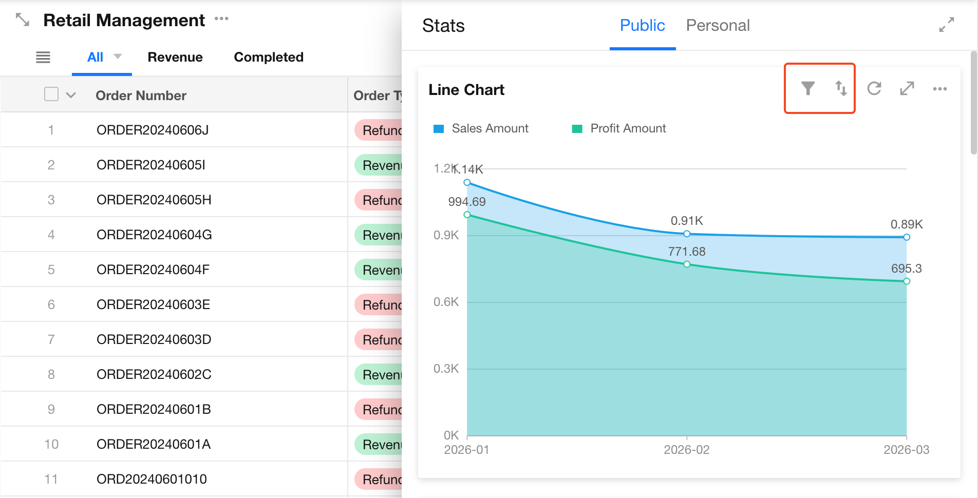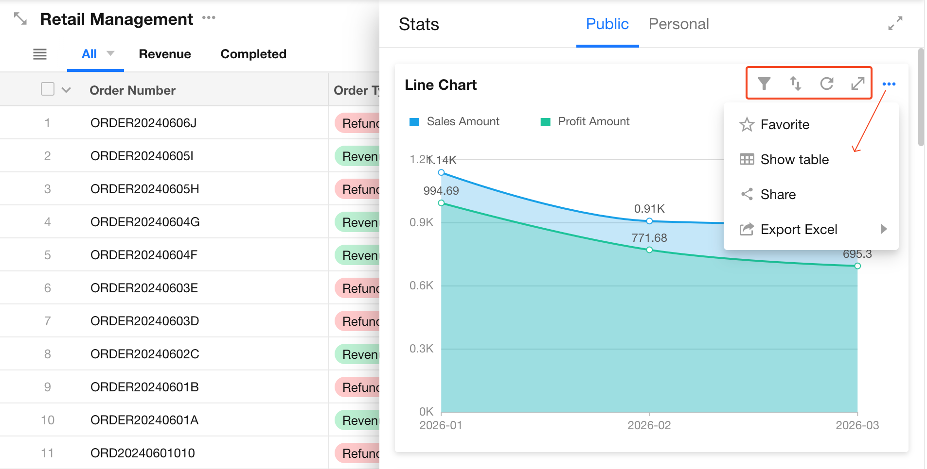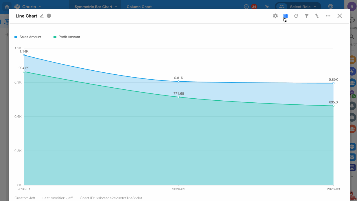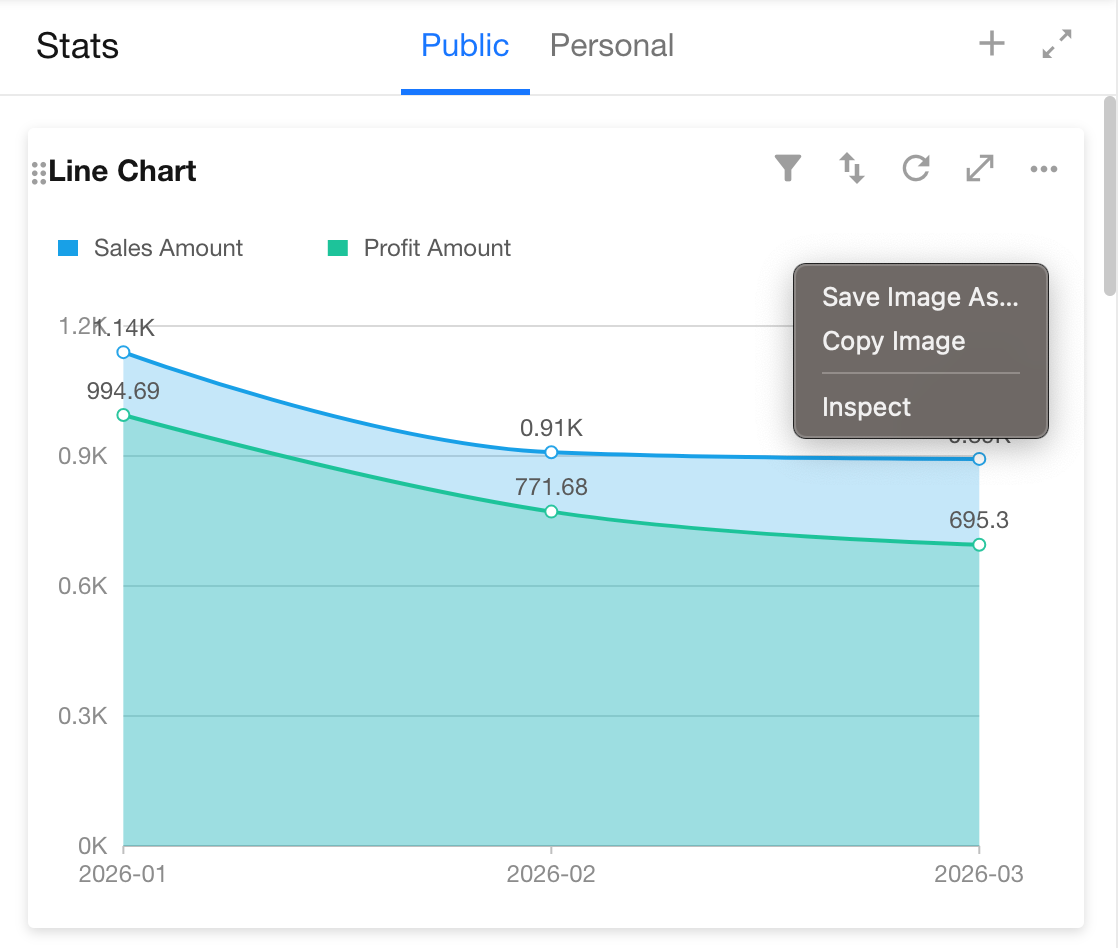 When viewing charts, regular users can perform actions such as filtering, sorting, exporting, saving as images, and sharing.
