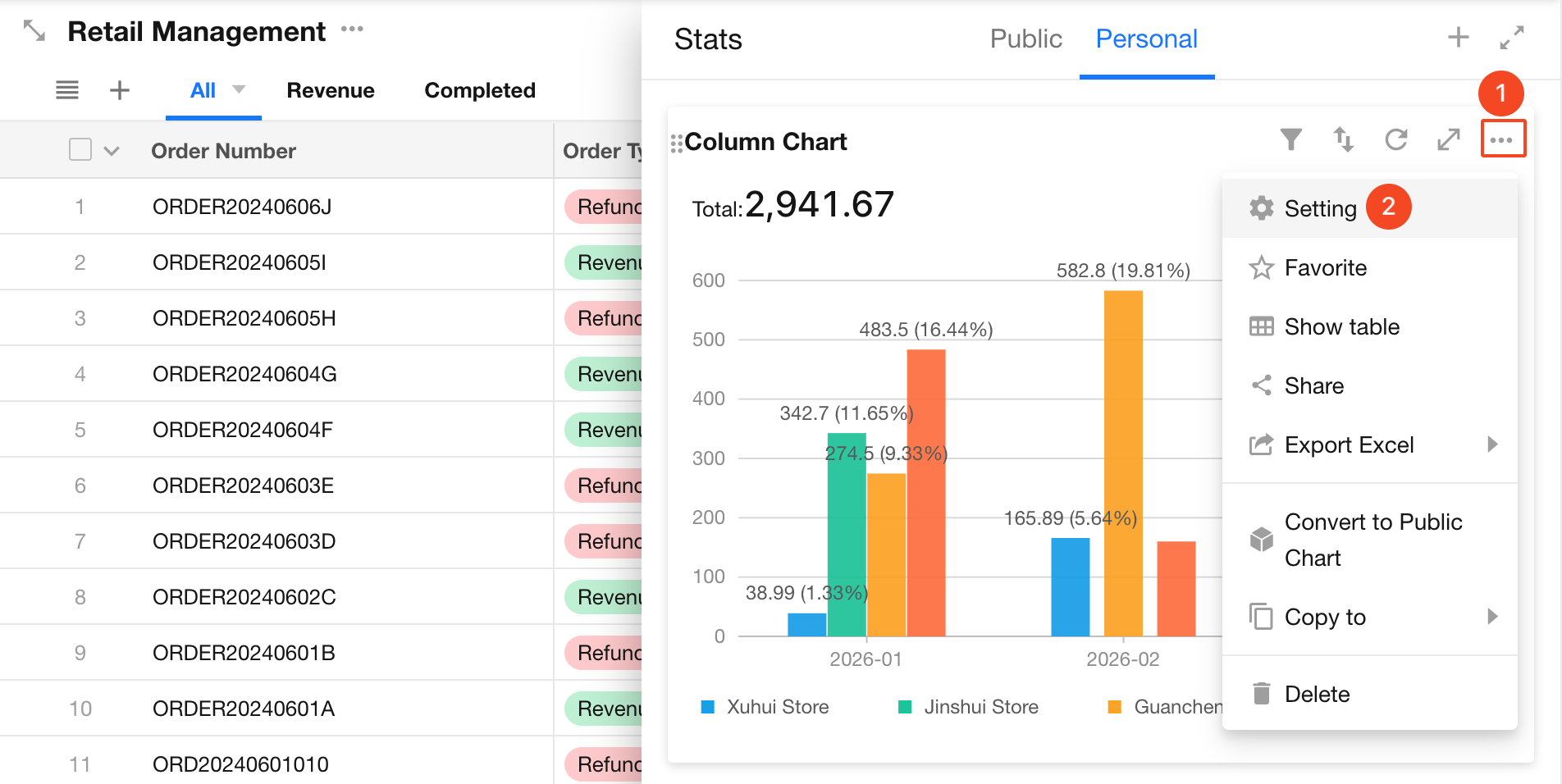 Click the ... (More) button in the top-right corner of the chart, then select Setting to reconfigure it. The configuration process is the same as when creating a chart.