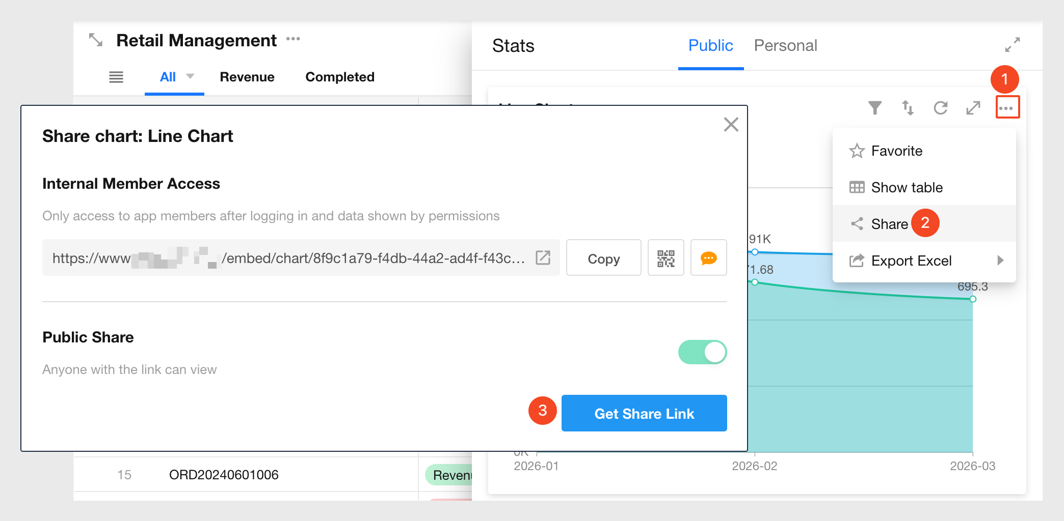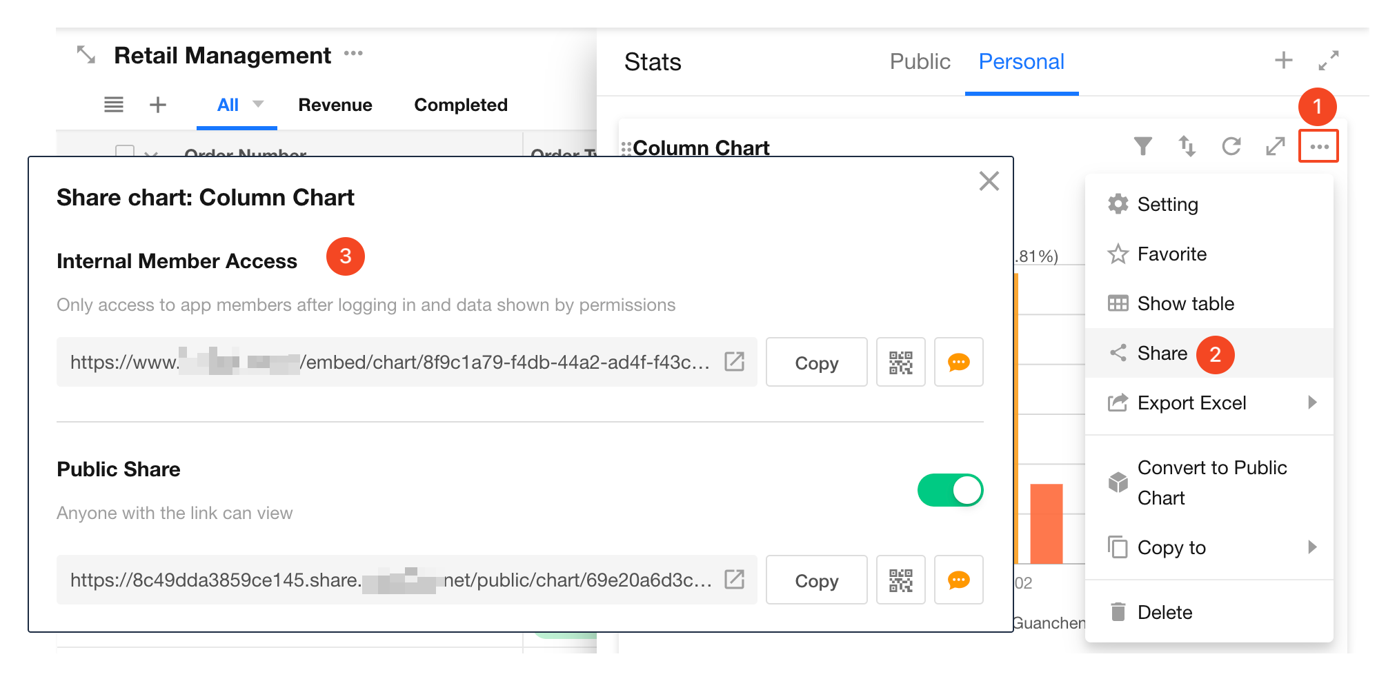 Application admins can enable chart sharing. Once enabled, other members can share charts externally via links or QR codes.