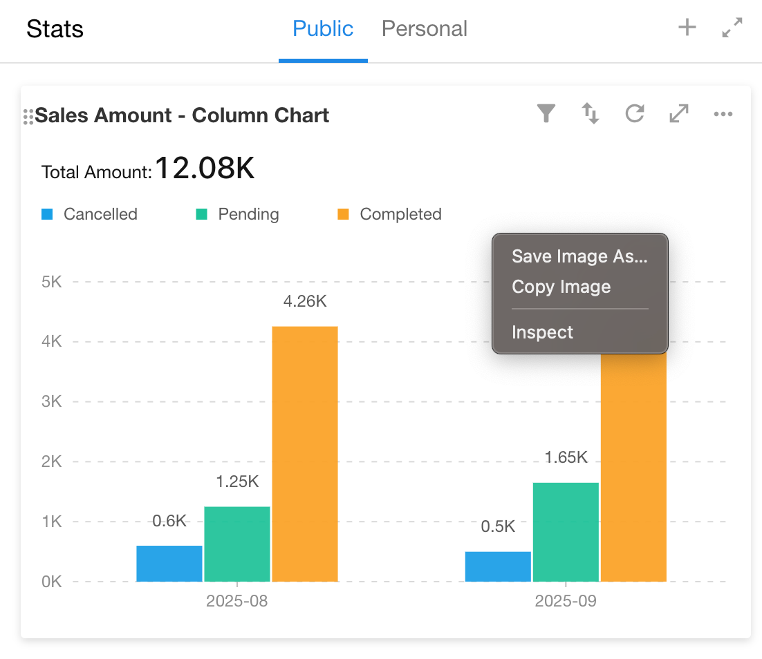 End users can perform various custom operations when viewing charts, including additional filtering, sorting, exporting, saving as images, and external sharing.