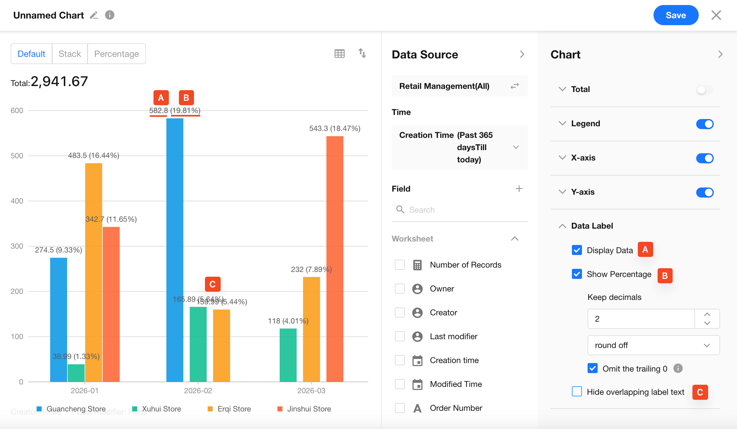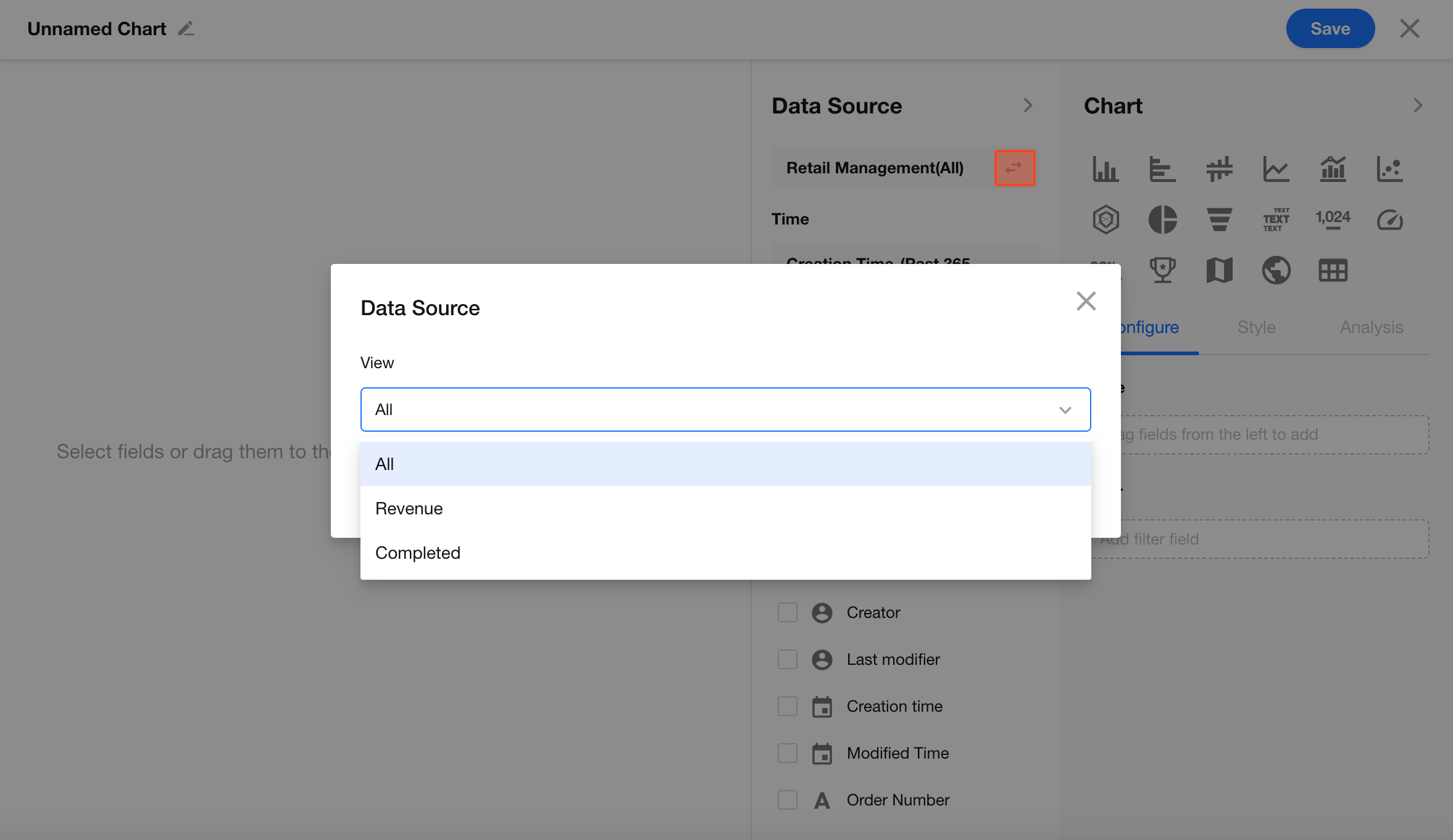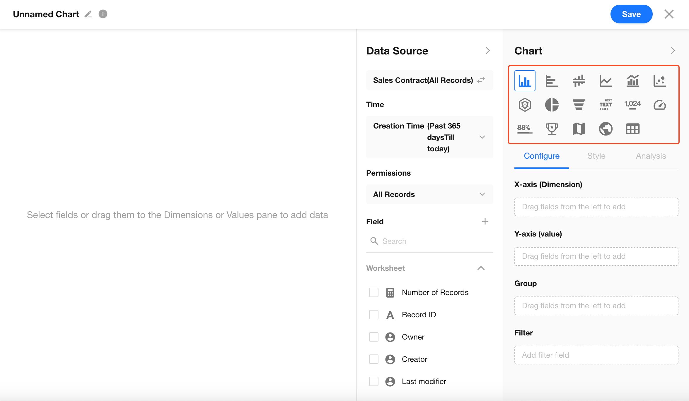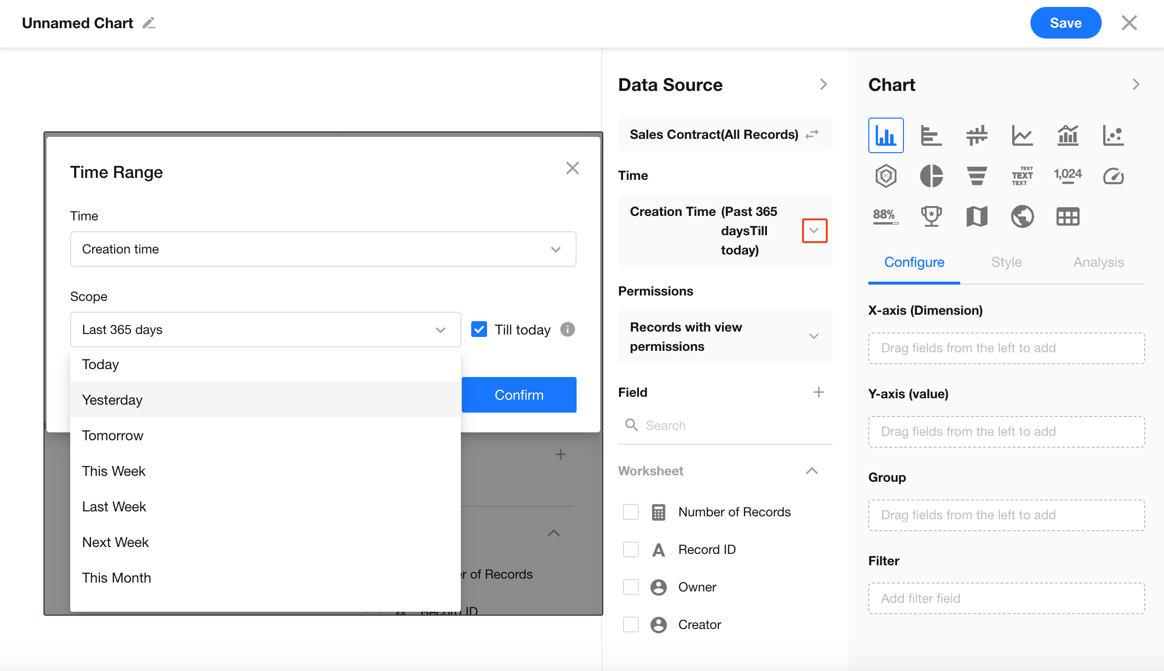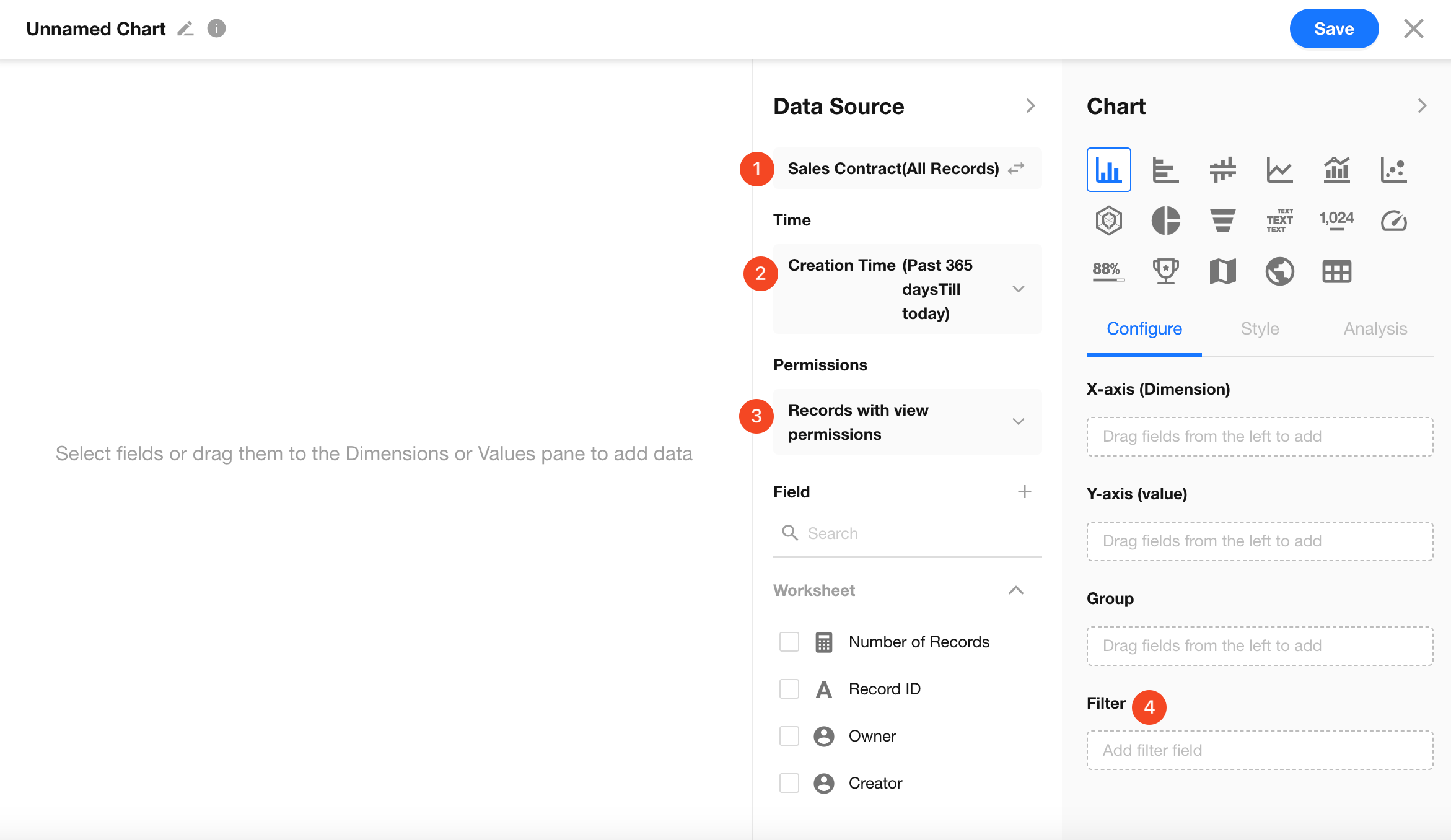 By default, charts include all records in the current worksheet. You can also select a specific view to quickly filter the data source.