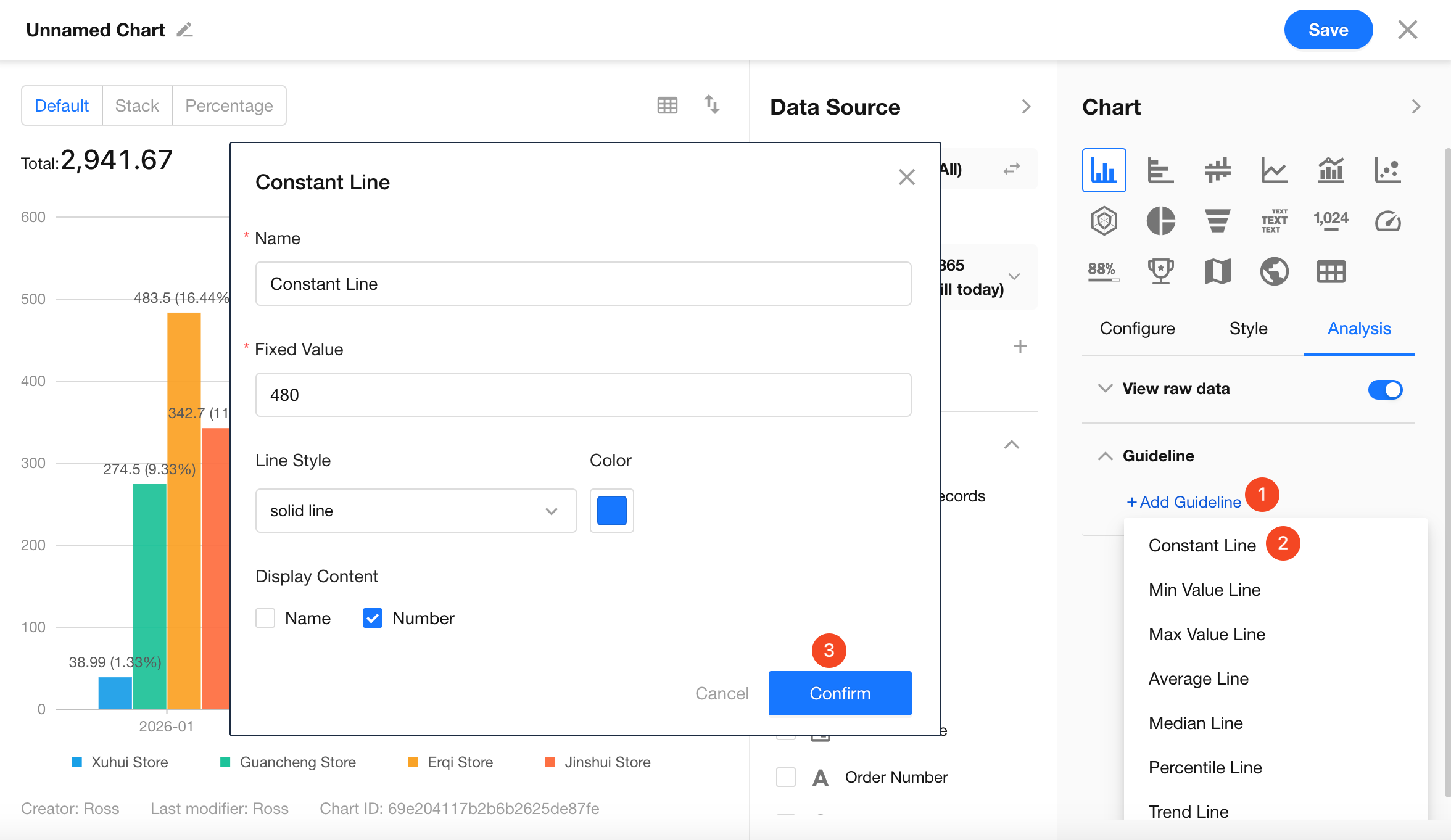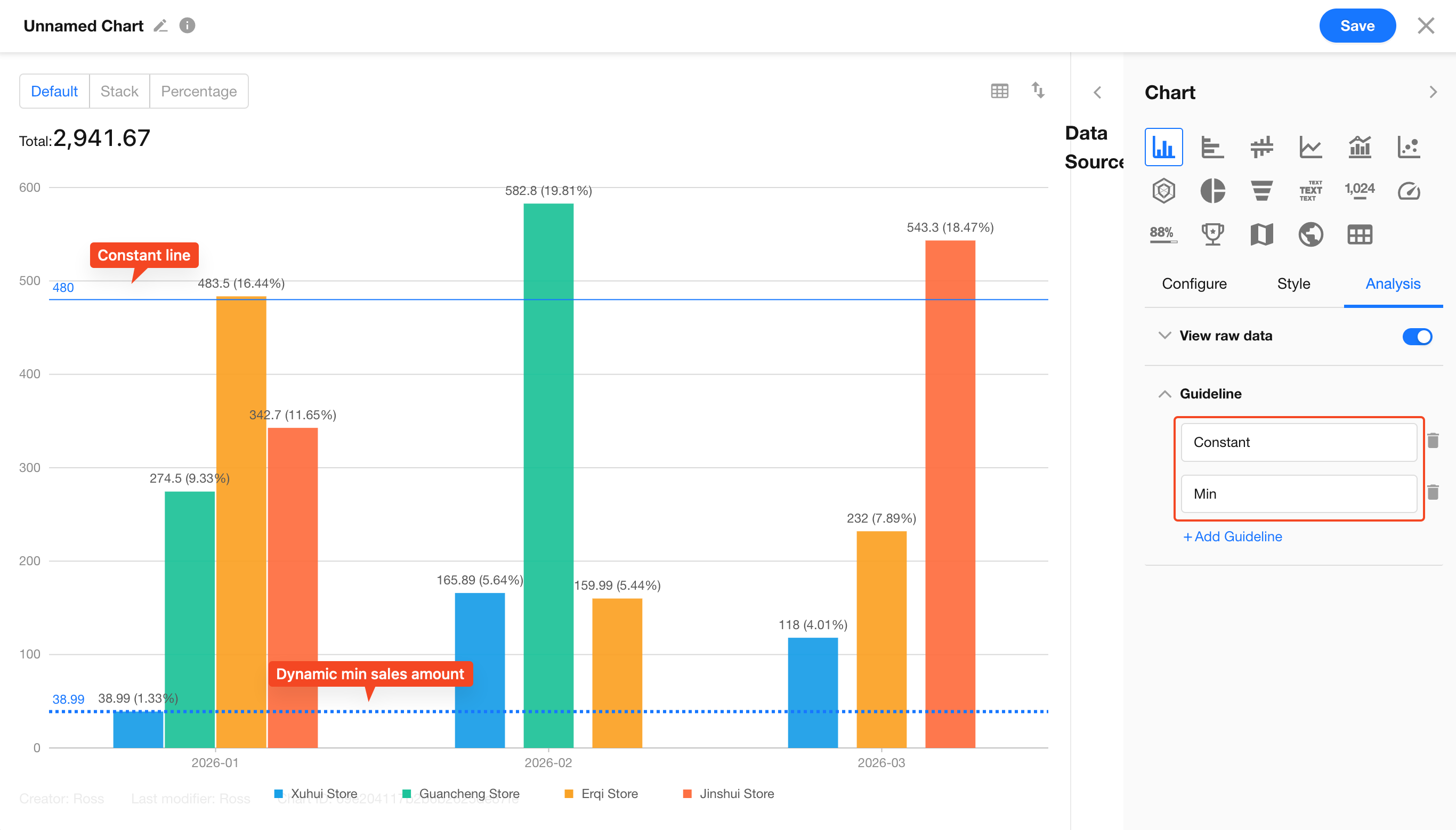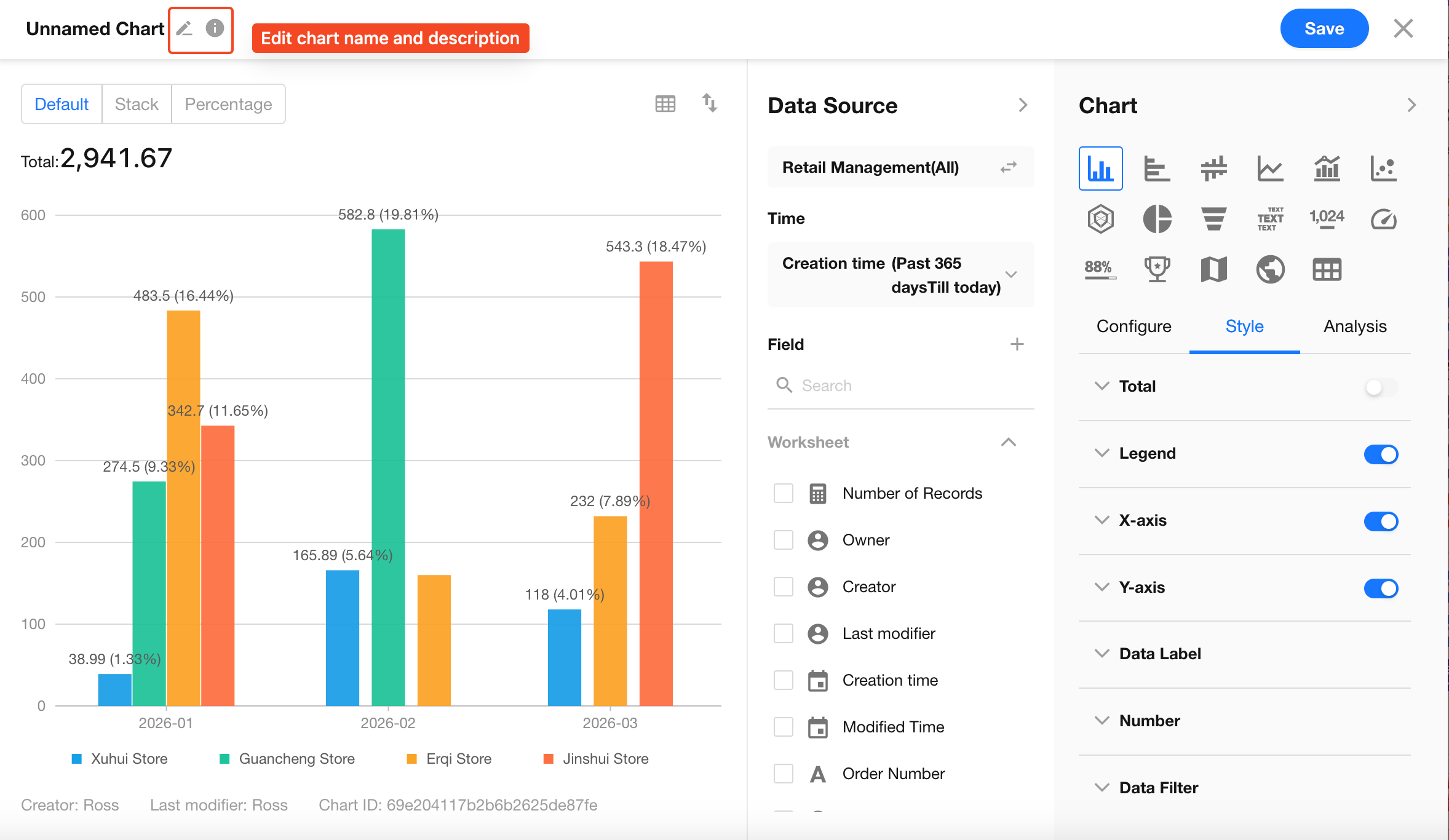 Click the edit button in the top-left corner of the chart to set the chart name and description, then click Save to complete the configuration.