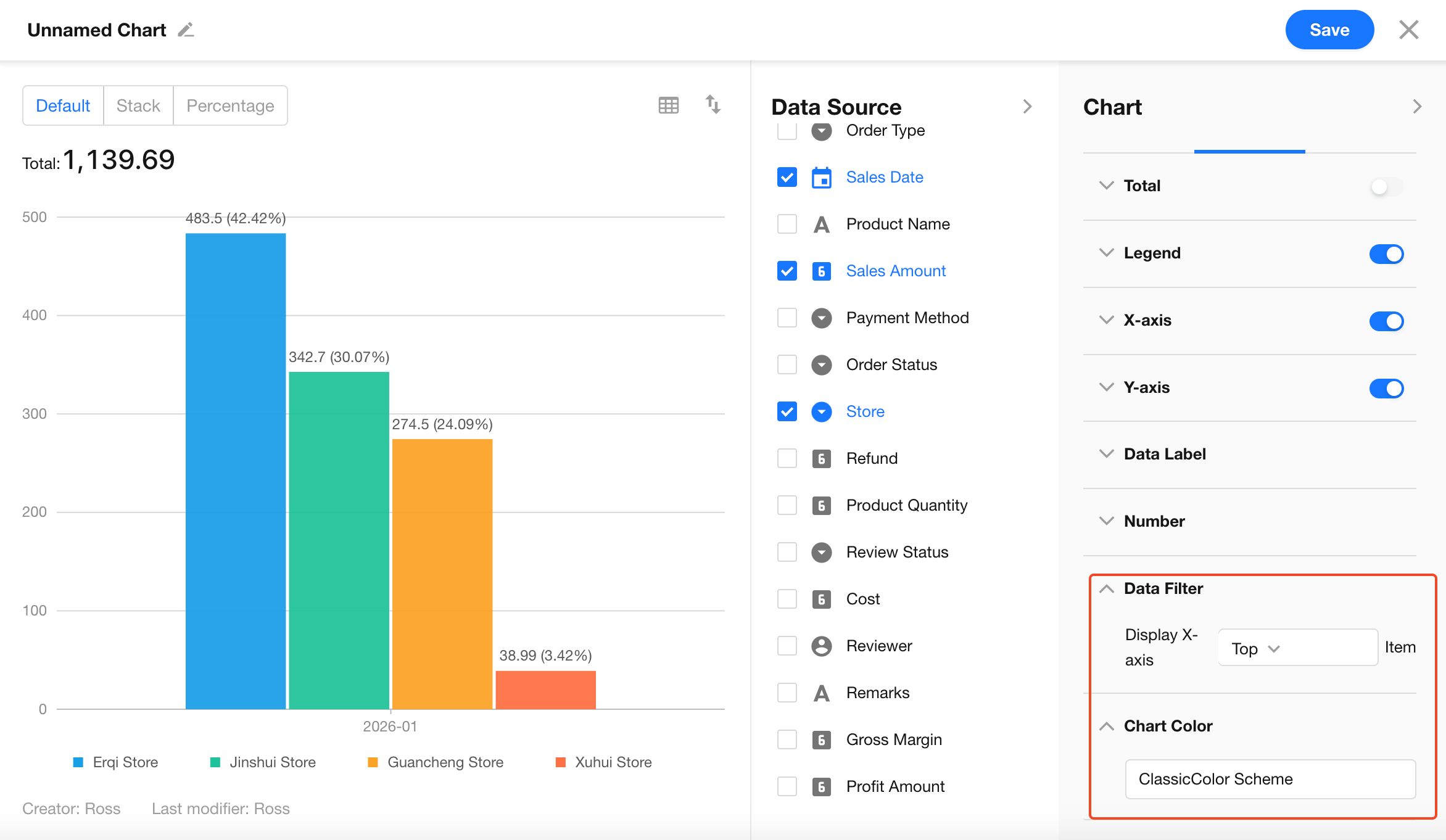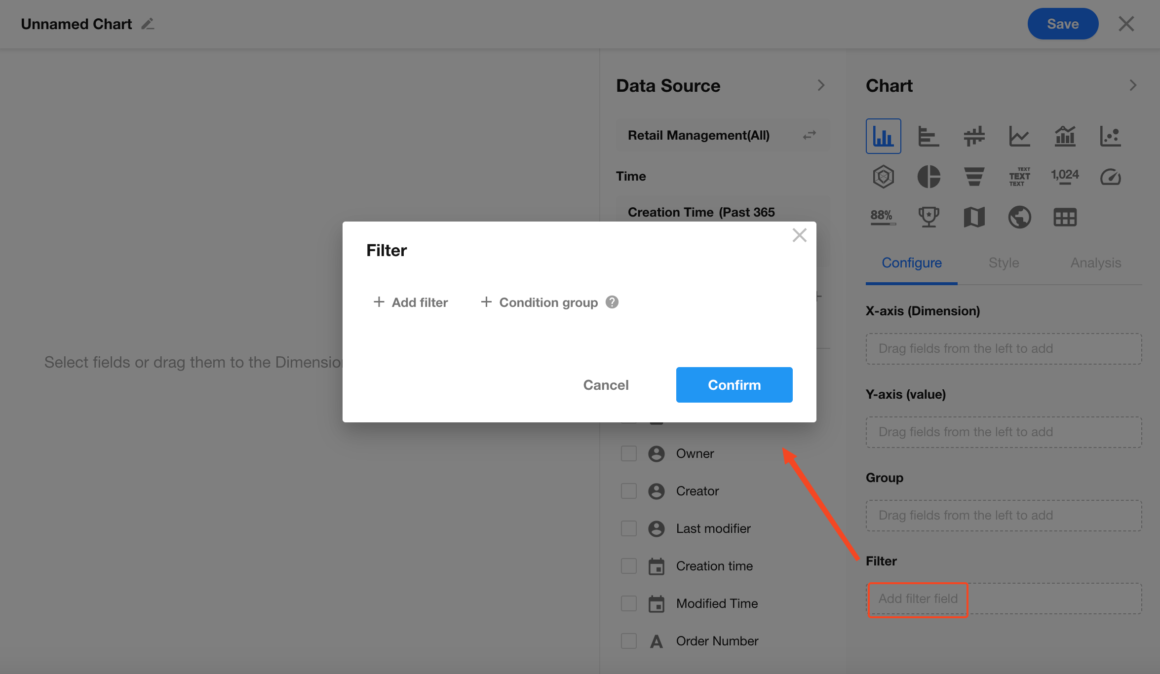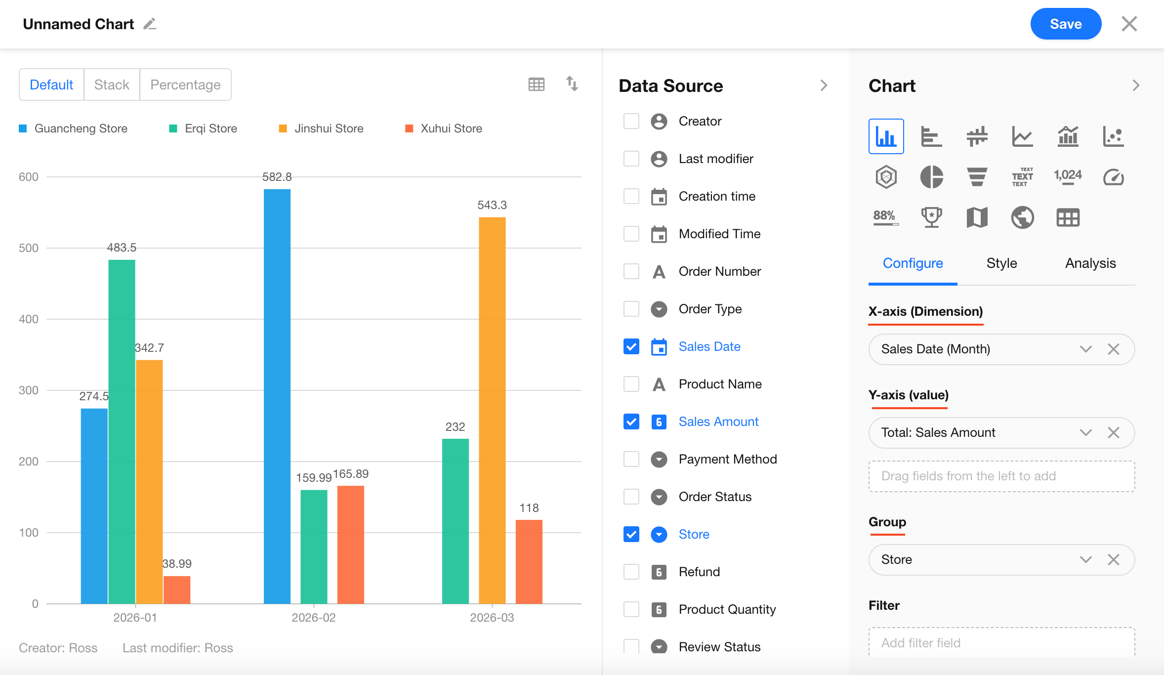 Click the edit button in the top-left corner of the chart to set the chart name and description, then click Save to complete the configuration.