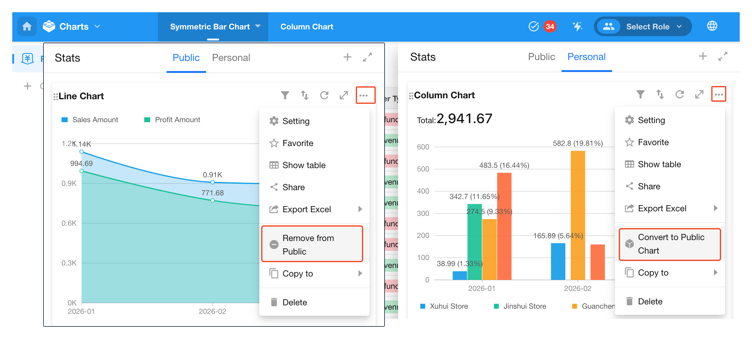 You can convert a chart between personal and public in the chart’s More options.